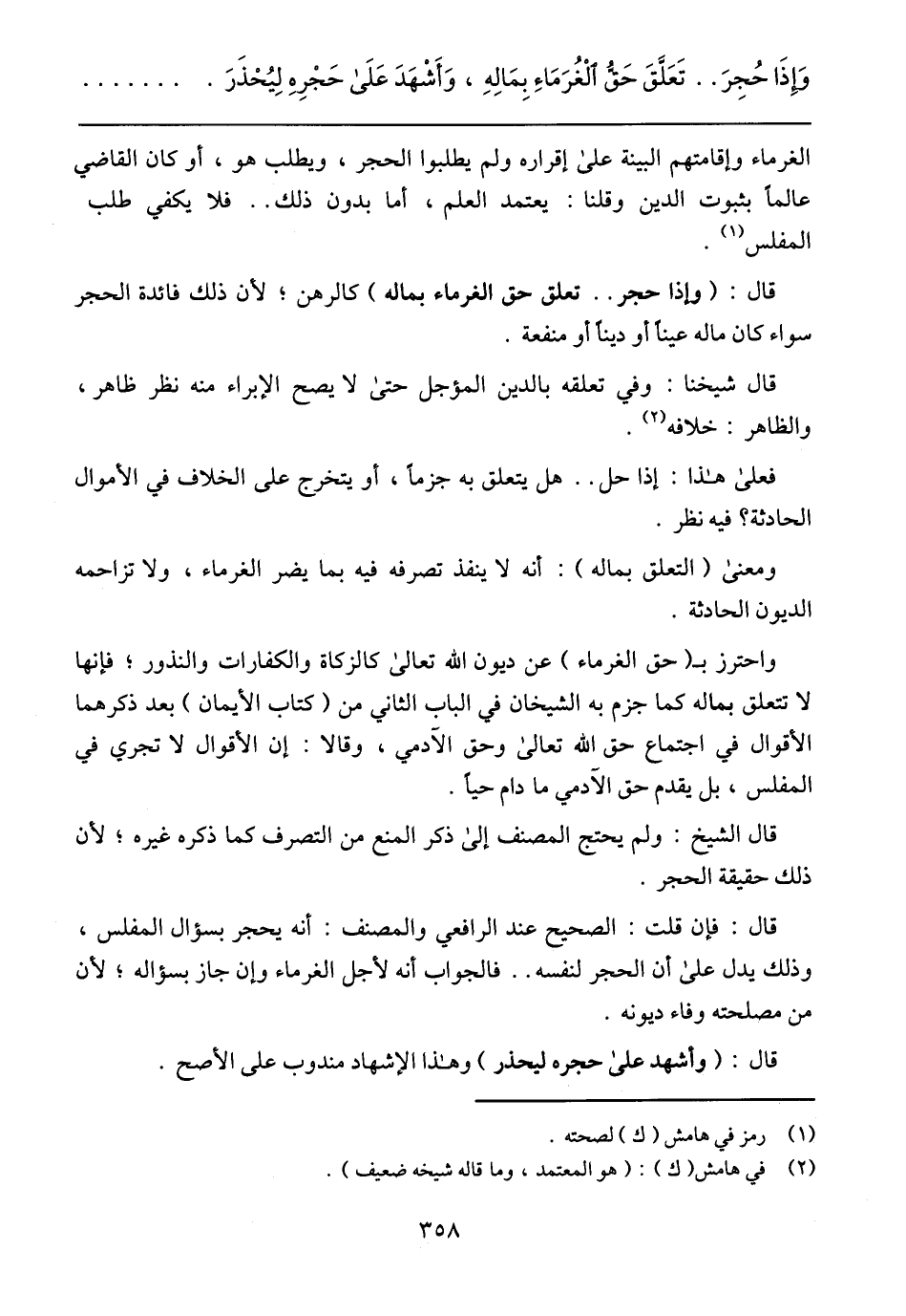 وَإِذَا حُجِرَ .. تَعَلَّقَ حَقُّ الْغُرَمَاءِ بِمَالِهِ، وَأَشْهَدَ عَلَى حَجْرِهِ لِيُحْذَرَ