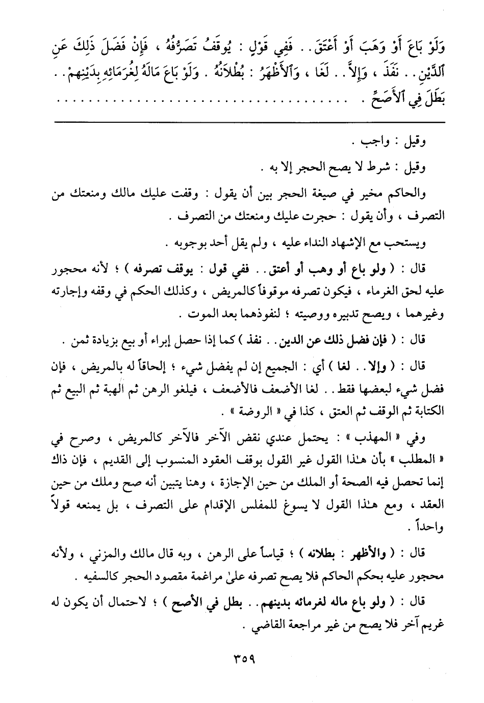 وَلَوْ بَاعَ أَوْ وَهَبَ أَوْ أَعْتَقَ .. فَفِي قَوْلٍ: يُوقَفُ تَصَرُّفُهُ، فَإِنْ فَضَلَ ذَلِكَ عَنِ الدَّيْنِ .. نَفَذَ، وَإِلَّا .. لَغَا، وَالأَظْهَرُ: بُطْلَانُهُ. وَلَوْ بَاعَ مَالَهُ لِغُرَمَائِهِ بِدَيْنِهمْ .. بَطَلَ فِي الأَصَحِّ