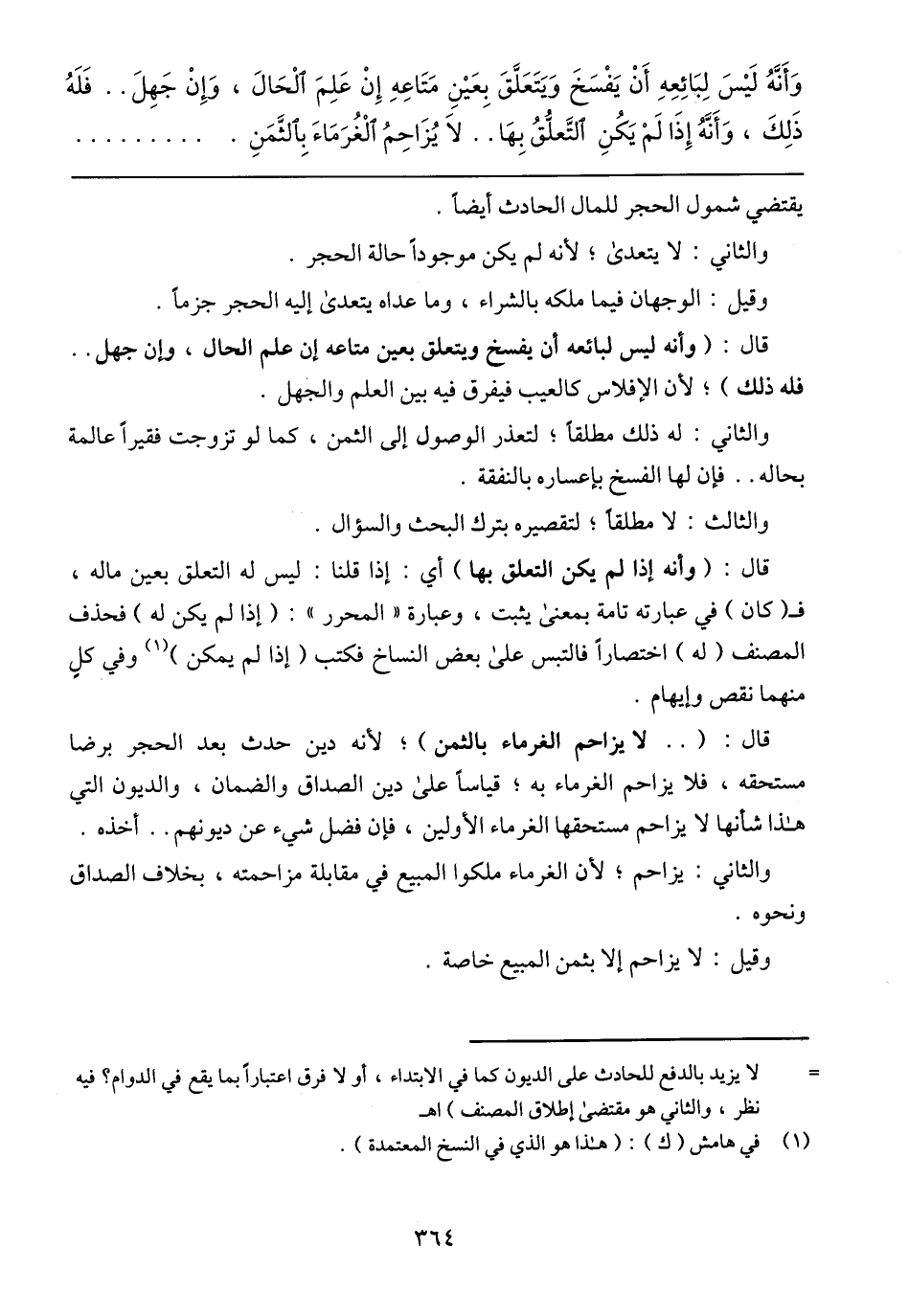 وَأَنَّهُ لَيْسَ لِبَائِعِهِ أَنْ يَفْسَخَ وَيَتَعَلَّقَ بِعَيْنِ مَتَاعِهِ إِنْ عَلِمَ الْحَالَ، وَإِنْ جَهِلَ .. فَلَهُ ذَلِكَ، وَأَنَّهُ إِذَا لَمْ يَكُنِ التَّعلُّقُ بِهَا .. لَا يُزَاحِمُ الْغُرَمَاءَ بِالثَّمَنِ
