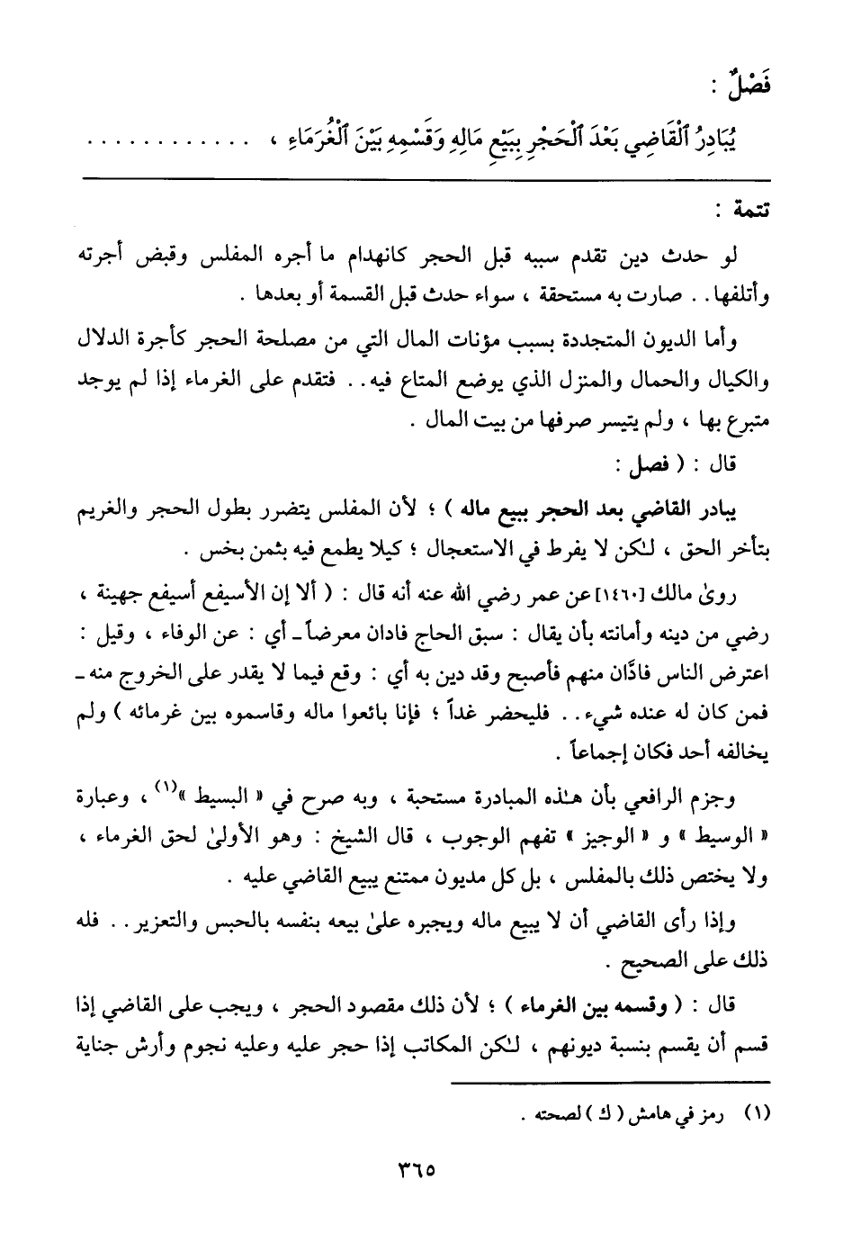 روى مالك [1460] عن عمر رضي الله عنه أنه قال: (ألا إن الأسيفع أسيفع جهينة، رضي من دينه وأمانته بأن يقال: سبق الحاج فادان معرضًا -أي: عن الوفاء، وقيل: اعترض الناس فادَّان منهم فأصبح وقد دين به أي: وقع فيما لا يقدر على الخروج منه- فمن كان له عنده شيء .. فليحضر غدًا؛ فإنا بائعوا ماله وقاسموه بين غرمائه) ولم يخالفه أحد فكان إجماعًا.