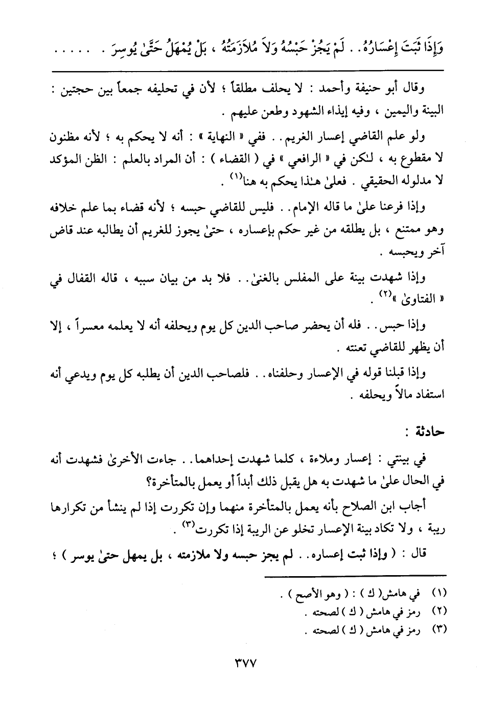وإذا فرعنا على ما قاله الإمام .. فليس للقاضي حبسه؛ لأنه قضاء بما علم خلافه وهو ممتنع، بل يطلقه من غير حكم بإعساره، حتى يجوز للغريم أن يطالبه عند قاض آخر ويحبسه.