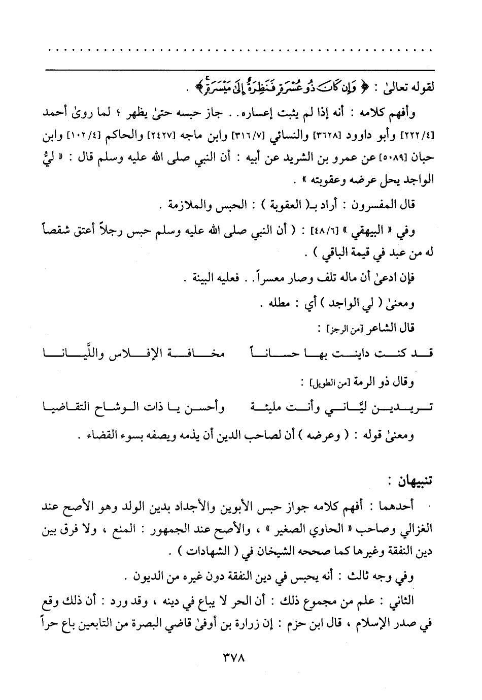 وأفهم كلامه: أنه إذا لم يثبت إعساره .. جاز حبسه حتى يظهر؛ لما روى أحمد [4/ 222] وأبو داوود [3628] والنسائي [7/ 316] وابن ماجه [2427] والحاكم [4/ 102] وابن حبان [5089] عن عمرو بن الشريد عن أبيه: أن النبي صلى الله عليه وسلم قال: (ليُّ الواجد يحل عرضه وعقوبته).