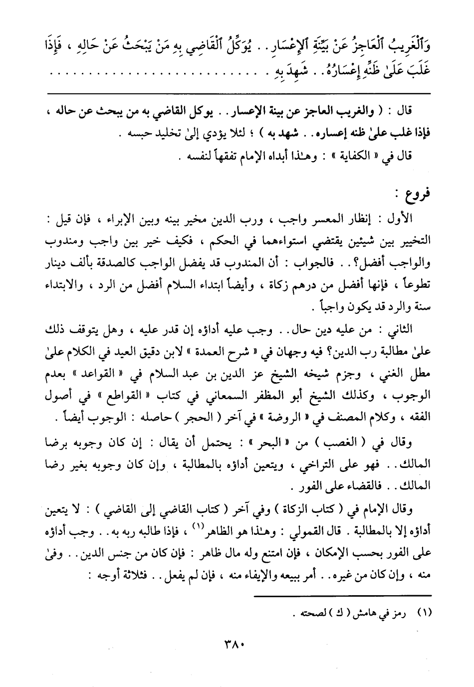 الثاني: من عليه دين حال .. وجب عليه أداؤه إن قدر عليه، وهل يتوقف ذلك على مطالبة رب الدين؟ فيه وجهان في (شرح العمدة) لابن دقيق العيد في الكلام على مطل الغني، وجزم شيخه الشيخ عز الدين بن عبد السلام في (القواعد) بعدم الوجوب، وكذلك الشيخ أبو المظفر السمعاني في كتاب (القواطع) في أصول الفقه، وكلام المصنف في (الروضة) في آخر (الحجر) حاصله: الوجوب أيضًا.