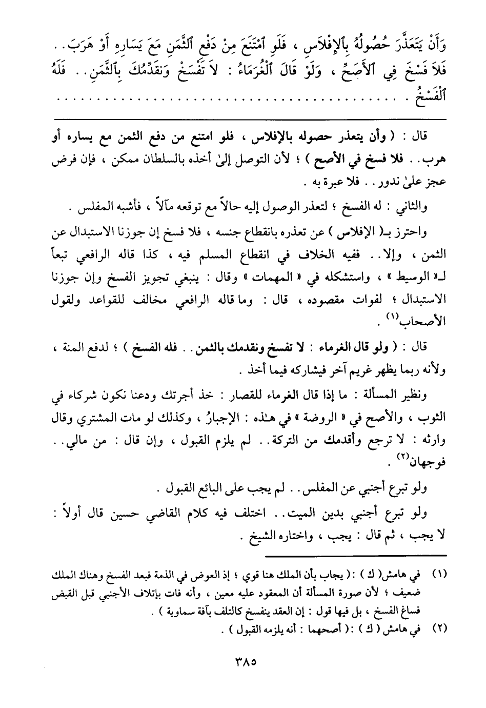 قال: (وأن يتعذر حصوله بالإفلاس، فلو امتنع من دفع الثمن مع يساره أو هرب .. فلا فسخ في الأصح)؛ لأن التوصل إلى أخذه بالسلطان ممكن، فإن فرض عجز على ندور .. فلا عبرة به.