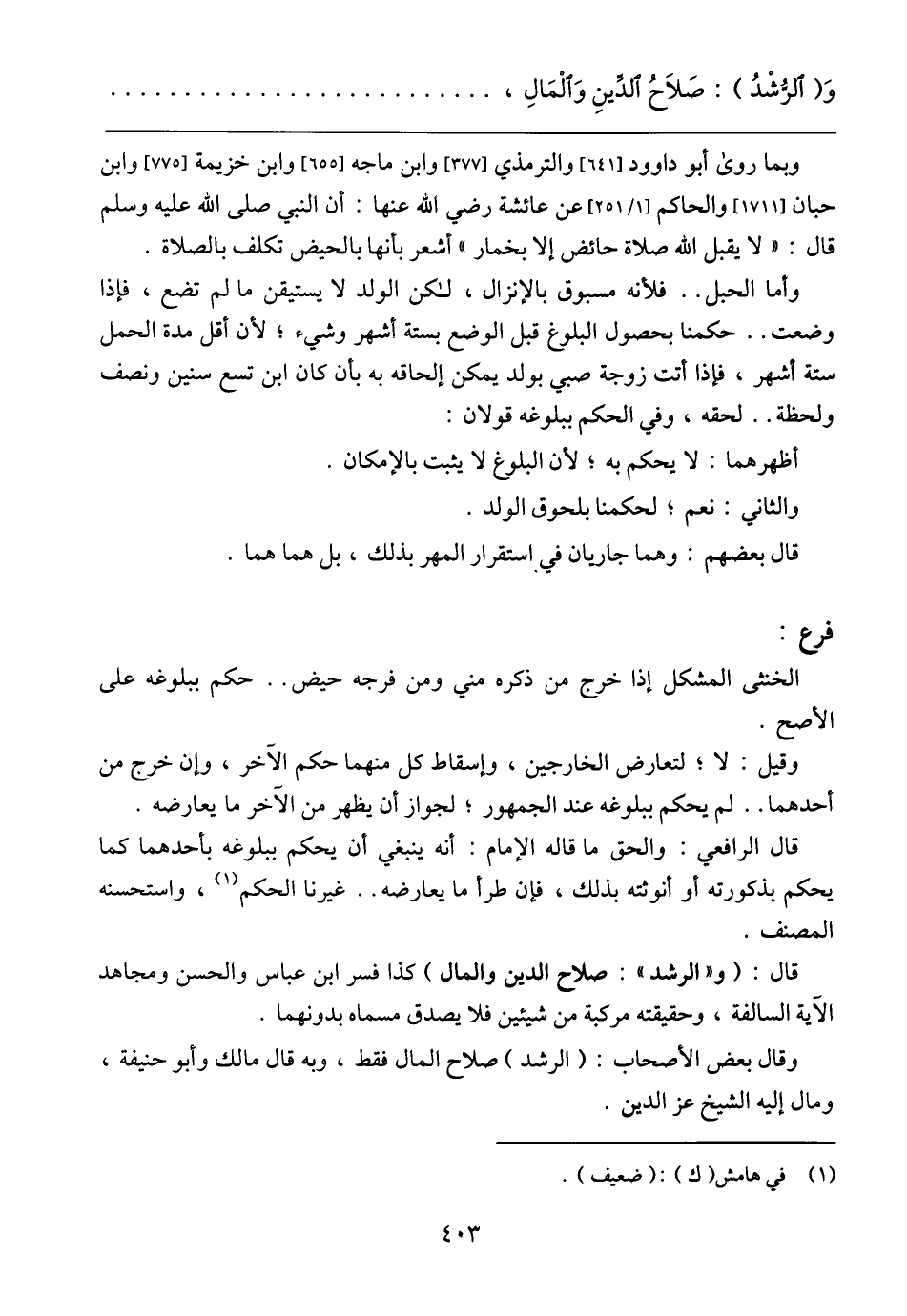 قال: (و (الرشد): صلاح الدين والمال) كذا فسر ابن عباس والحسن ومجاهد الآية السالفة، وحقيقته مركبة من شيئين فلا يصدق مسماه بدونهما.