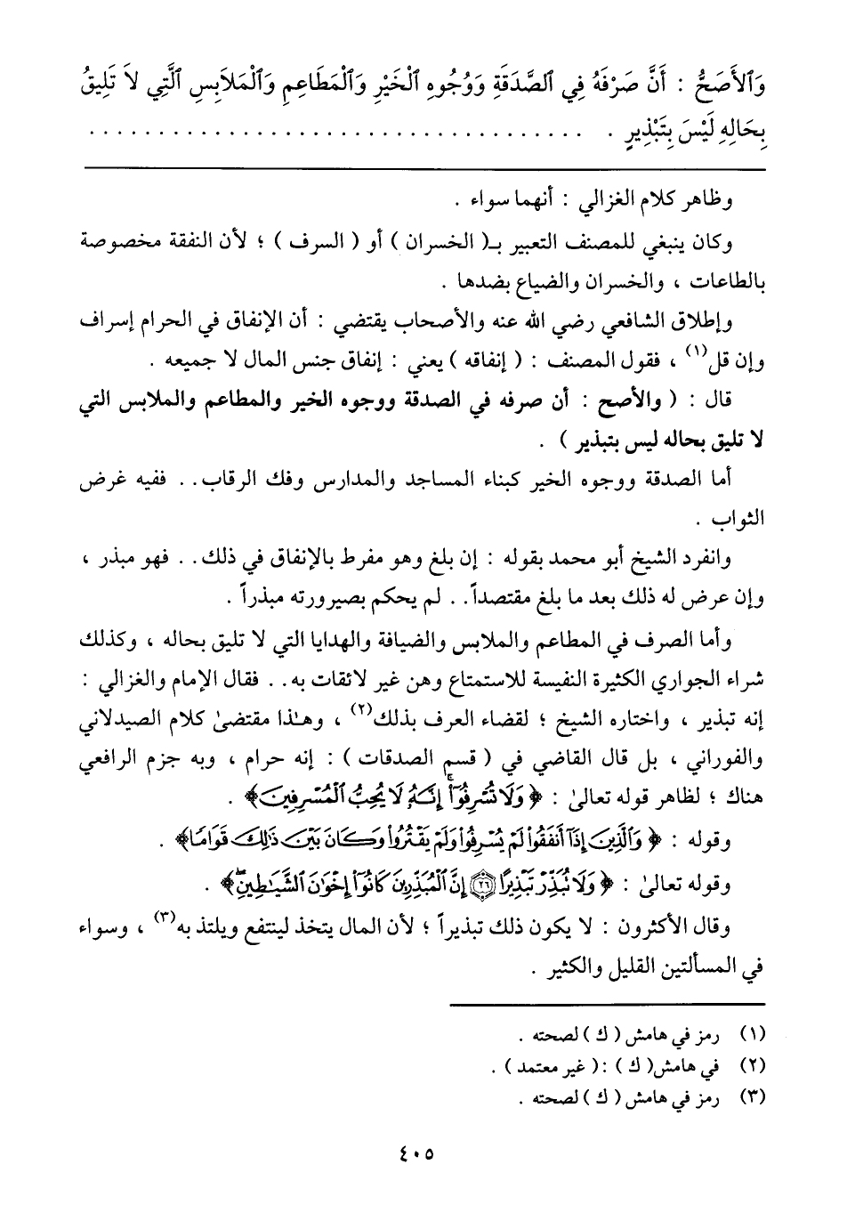 وأما الصرف في المطاعم والملابس والضيافة والهدايا التي لا تليق بحاله، وكذلك شراء الجواري الكثيرة النفيسة للاستمتاع وهن غير لائقات به .. فقال الإمام والغزالي: إنه تبذير، واختاره الشيخ؛ لقضاء العرف بذلك، وهذا مقتضى كلام الصيدلاني والفوراني، بل قال القاضي في (قسم الصدقات): إنه حرام، وبه جزم الرافعي هناك؛ لظاهر قوله تعالى: {ولا تسرفوا إنه لا يجب المسرفين}.