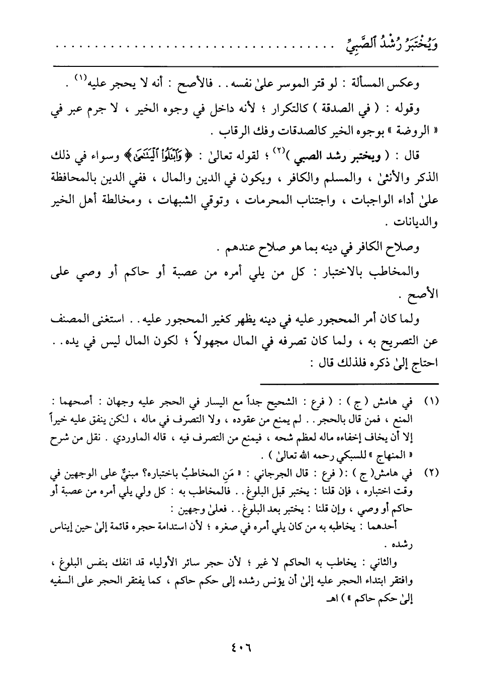 قال: (ويختبر رشد الصبي)؛ لقوله تعالى: {وابتلوا اليتمى} وسواء في ذلك الذكر والأنثى، والمسلم والكافر، ويكون في الدين والمال، ففي الدين بالمحافظة على أداء الواجبات، واجتناب المحرمات، وتوقي الشبهات، ومخالطة أهل الخير والديانات.