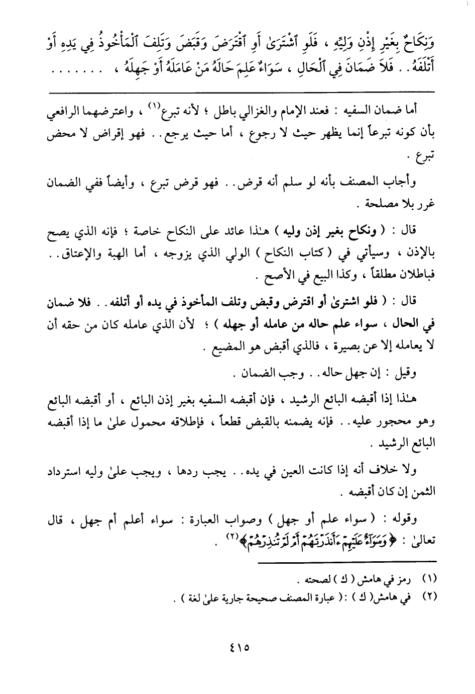 وَنِكَاحٌ بِغَيْرِ إِذْنِ وَلِيِّهِ، فَلَوِ اشْتَرَى أَوِ اقْتَرَضَ وَقَبَضَ وَتَلِفَ الْمَاخُوذُ فِي يَدِهِ أَوْ أَتْلَفَهُ .. فَلَا ضَمَانَ فِي الْحَالِ، سَوَاءٌ عَلِمَ حَالَهُ مَنْ عَامَلَهُ أَوْ جَهِلَهُ،