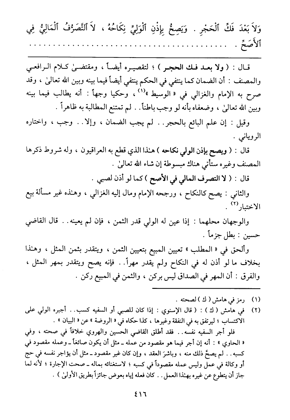 وَلَا بَعْدَ فَكِّ الْحَجْرِ. وَيَصِحُّ بِإِذْنِ الْوَلِيِّ نِكَاحُهُ، لَا التَّصَرُّفُ الْمَالِيُّ فِي الأَصَحِّ