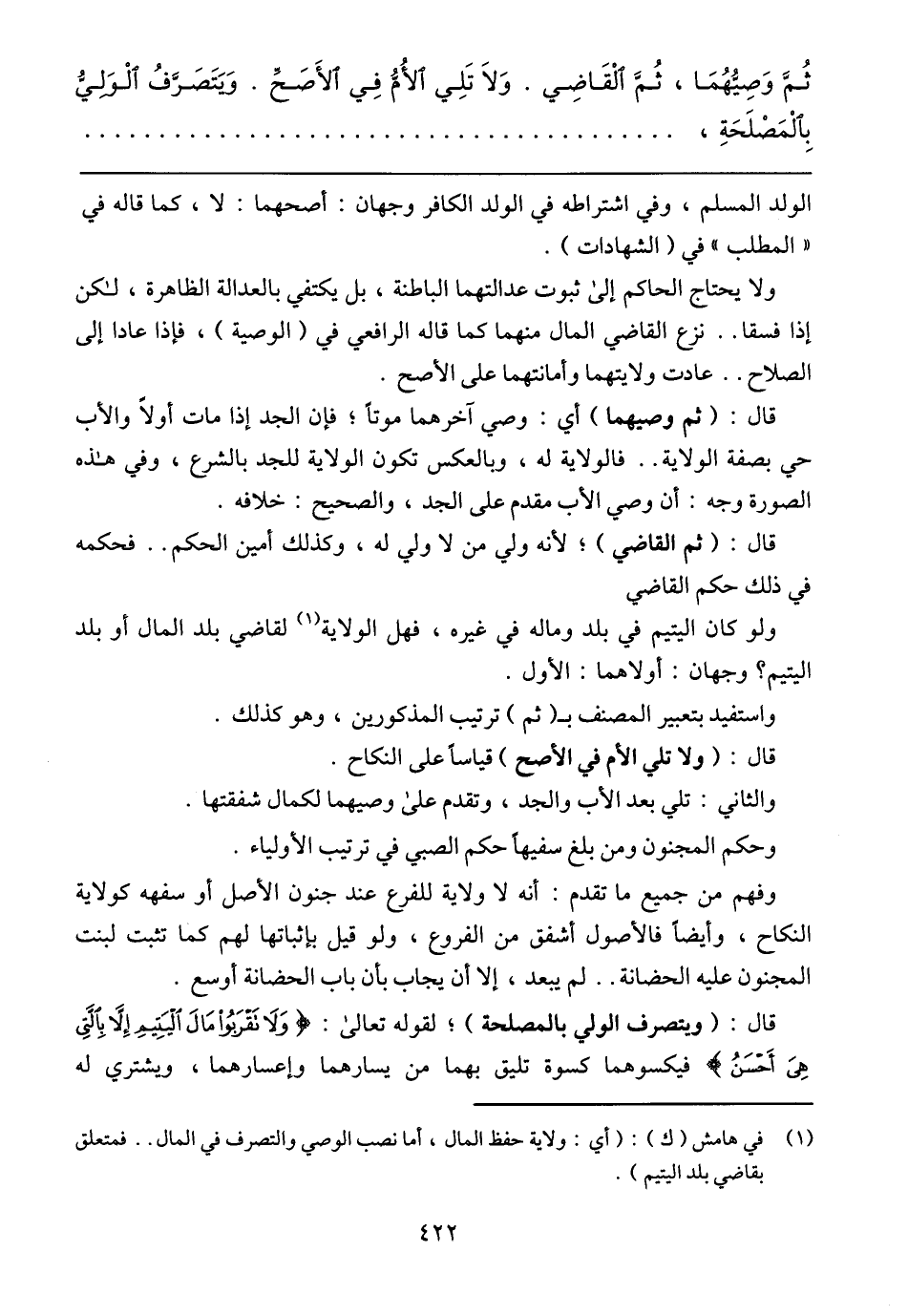 وفهم من جميع ما تقدم: أنه لا ولاية للفرع عند جنون الأصل أو سفهه كولاية النكاح، وأيضًا فالأصول أشفق من الفروع، ولو قيل بإثباتها لهم كما تثبت لبنت المجنون عليه الحضانة .. لم يبعد، إلإ أن يجاب بأن باب الحضانة أوسع.