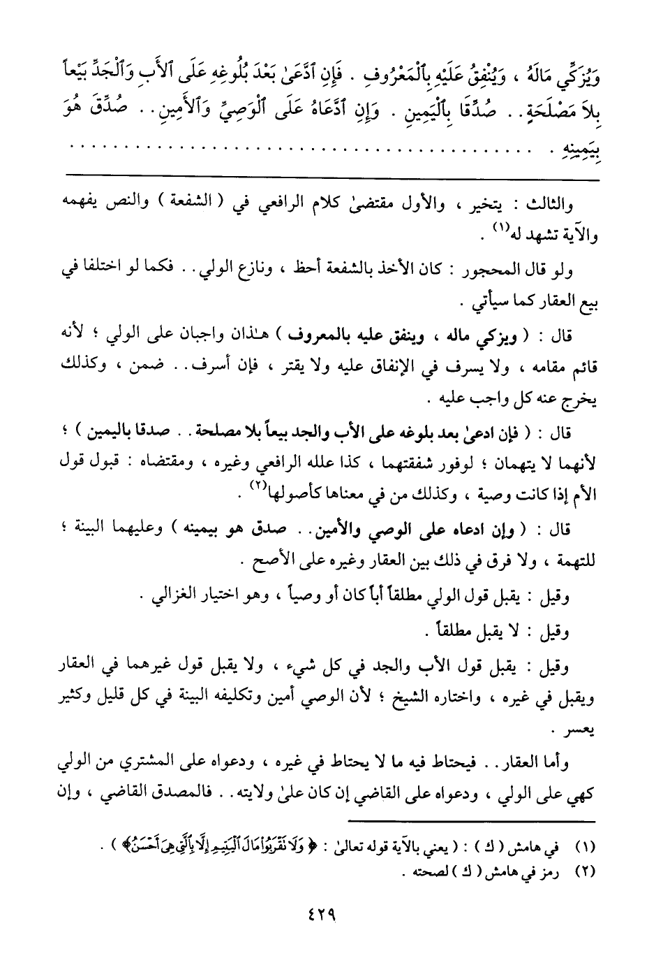 وَيُزَكِّي مَالَهُ، وَيُنْفِقُ عَلَيْهِ بِالْمَعْرُوفِ. فَإِنِ ادَّعَى بَعْدَ بُلُوغِهِ عَلَى الأَبِ وَالْجَدِّ بَيْعًا بِلَا مَصْلَحَةٍ .. صُدِّقَا بِالْيَمِينِ. وَإِنِ ادَّعَاهُ عَلَى الْوَصِيِّ وَالأَمِينِ .. صُدِّقَ هُوَ بِيَمِينِهِ.