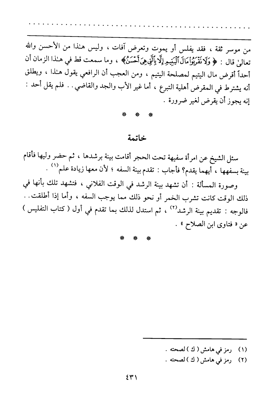 وصورة المسألة: أن تشهد بينة الرشد في الوقت الفلاني، فتشهد تلك بأنها في ذلك الوقت كانت تشرب الخمر أو نحو ذلك مما يوجب السفه، وأما إذا أطلقت .. فالوجه: تقديم بينة الرشد، ثم استدل لذلك بما تقدم في أول (كتاب التفليس) عن (فتاوى ابن الصلاح).