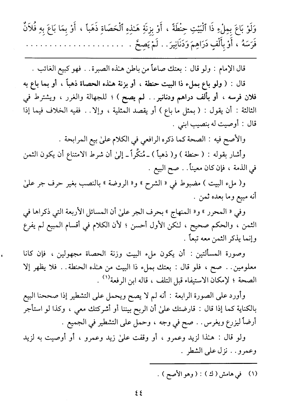 و (ملء البيت) مضبوط في (الشرح) و (الروضة) بالنصب بغير حرف جر على أنه مبيع وما بعده ثمن.