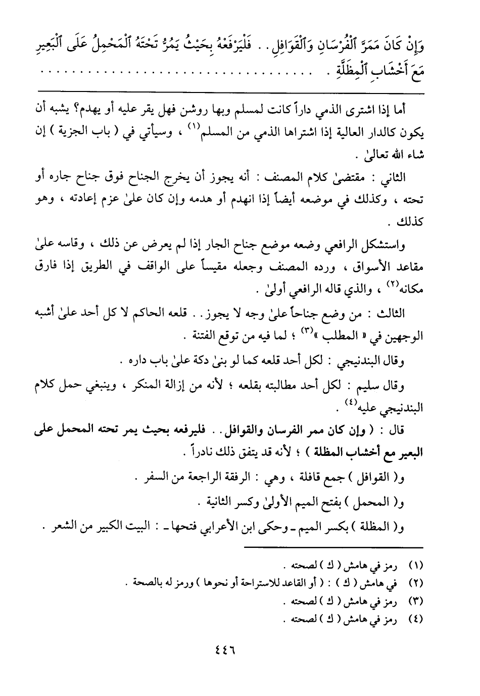 قال: (وإن كان ممر الفرسان والقوافل .. فليرفعه بحيث يمر تحته المحمل على البعير مع أخشاب المظلة)؛ لأنه قد يتفق ذلك نادرًا.