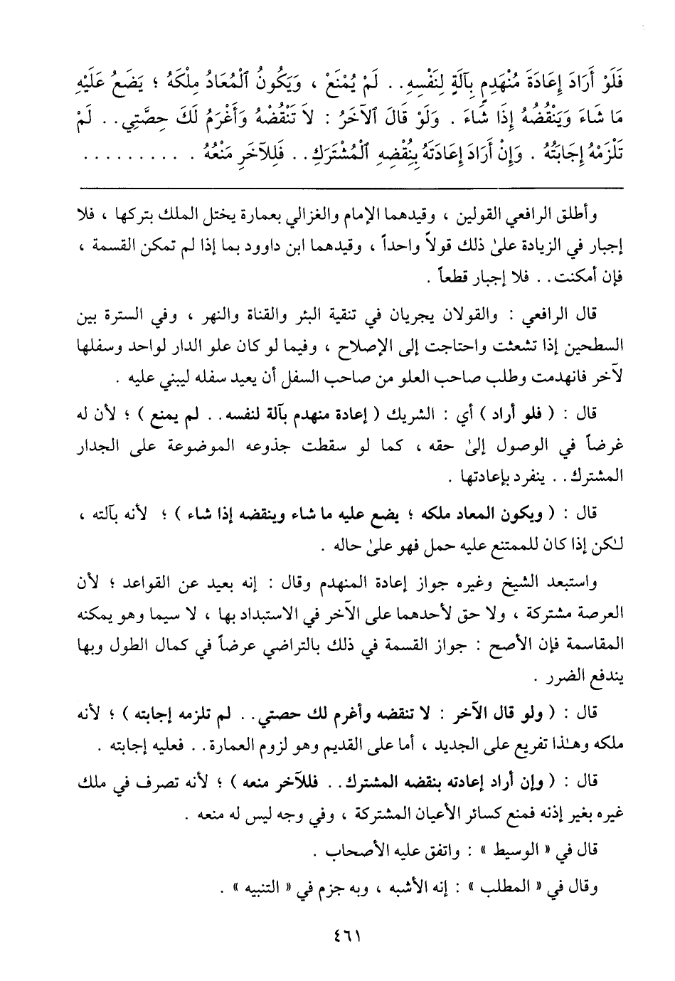 قال الرافعي: والقولان يجريان في تنقية البئر والقناة والنهر، وفي السترة بين السطحين إذا تشعثت واحتاجت إلى الإصلاح، وفيما لو كان علو الدار لواحد وسفلها لآخر فانهدمت وطلب صاحب العلو من صاحب السفل أن يعيد سفله ليبني عليه.