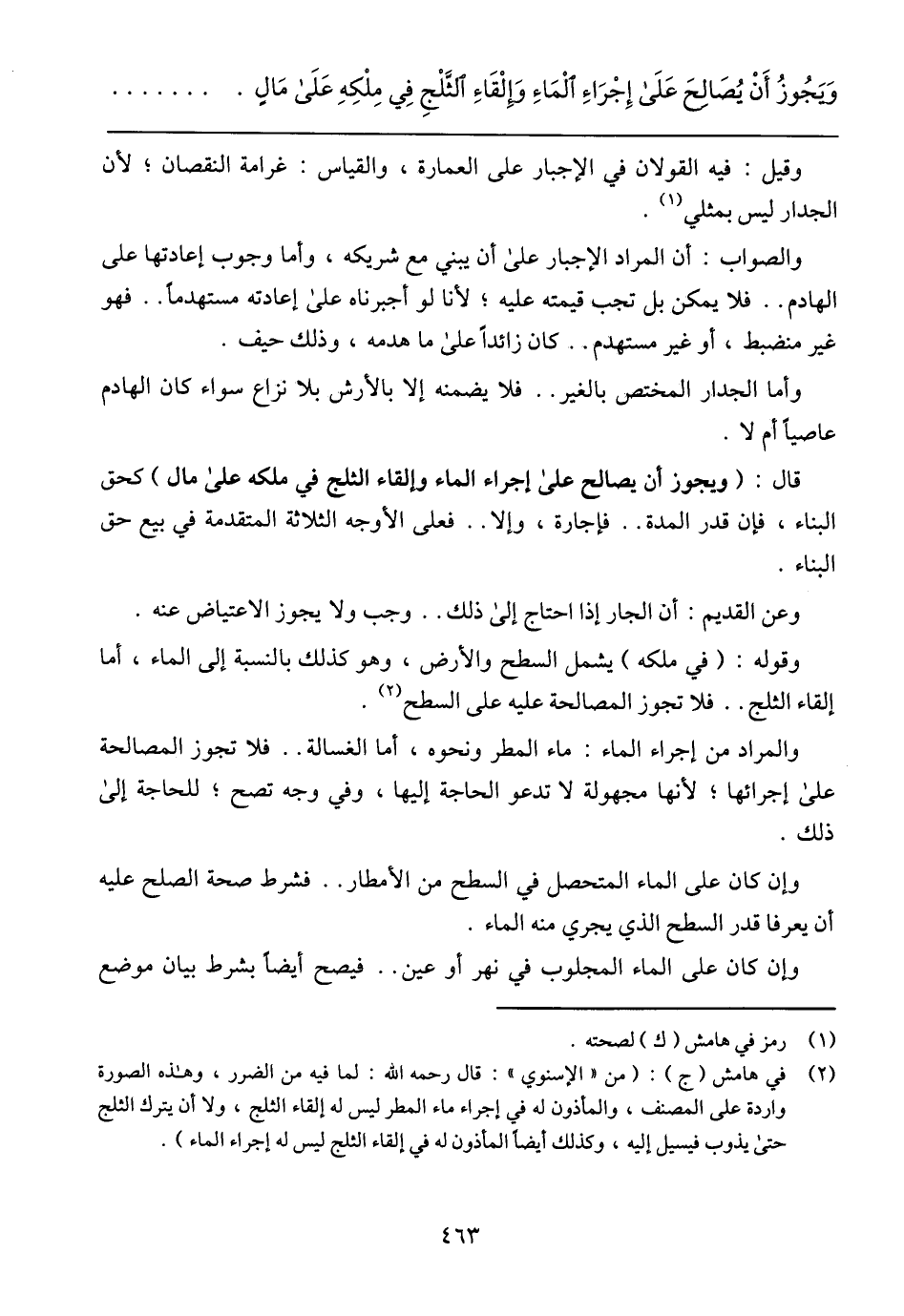 قال: (ويجوز أن يصالح على إجراء الماء وإلقاء الثلج في ملكه على مال) كحق البناء، فإن قدر المدة .. فإجارة، وإلا .. فعلى الأوجه الثلاثة المتقدمة في بيع حق البناء.