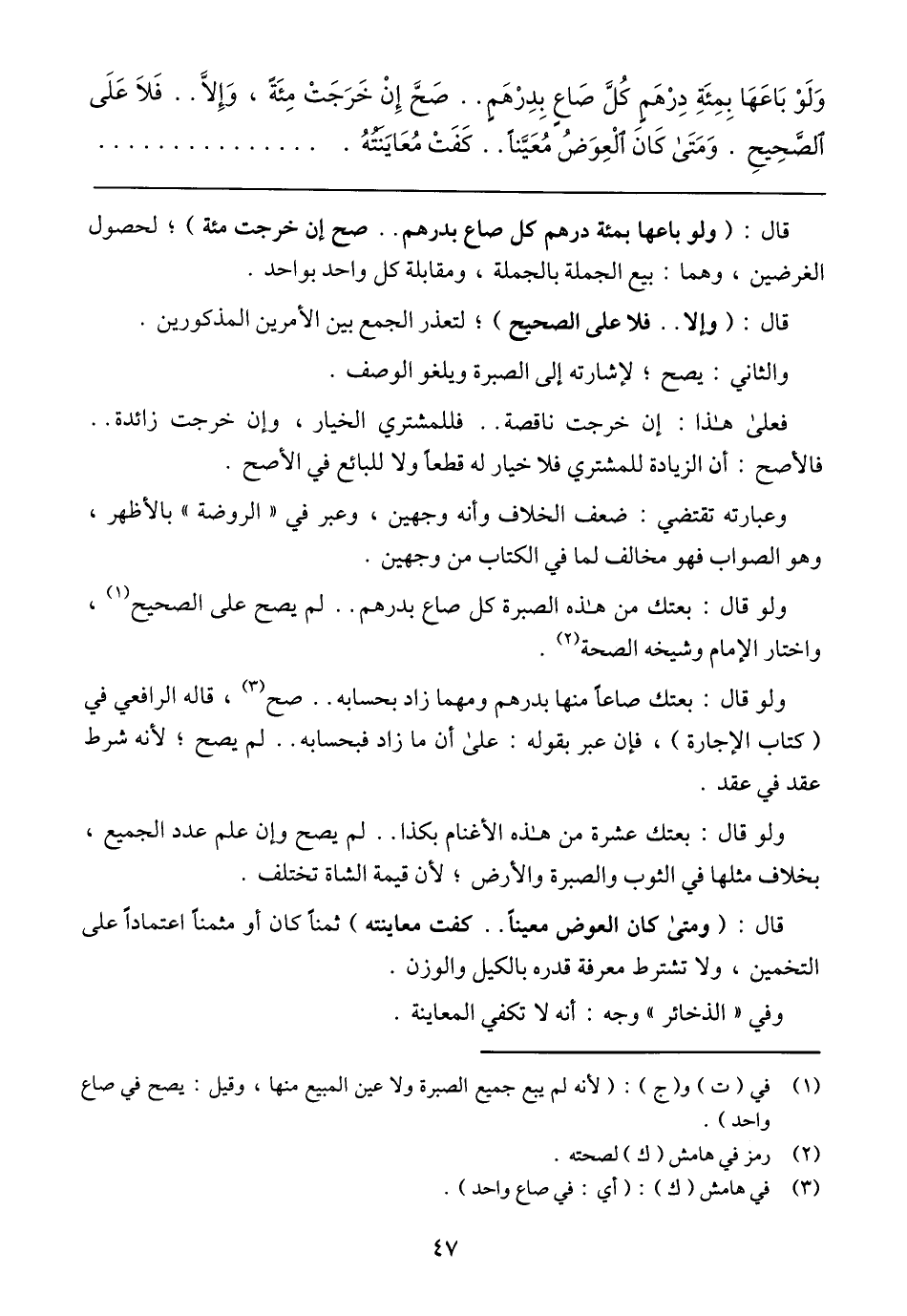 وَلَوْ بَاعَهَا بِمِئَةِ دِرْهَمٍ كُلَّ صَاعٍ بِدِرْهَمٍ .. صَحَّ إِنْ خَرَجَتْ مِئَةً، وَإِلَّا .. فَلَا عَلَى الصَّحِيحِ. وَمَتَى كَانَ الْعِوَضُ مُعَيَّنًا .. كَفَتْ مُعَايَنَتُهُ