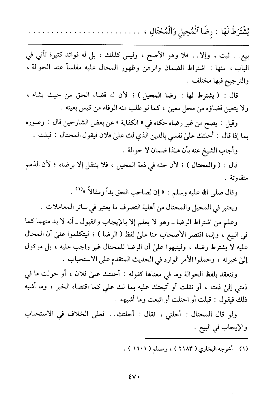 وعلم من اشتراط الرضا –وهو لا علم إلا بالإيجاب والقبول_ أنه لابد منهما كما في البيع، وإنما اقتصر الأصحاب هنا على لفظ (الرضا)؛ ليتكلموا على أن المحال عليه لا يشترط رضاه، ولينبهوا على أن الرضا للمحتال غير واجب عليه، بل موكول إلى خيرته، وحملوا الأمر الوارد في الحديث المتقدم على الاستحباب.