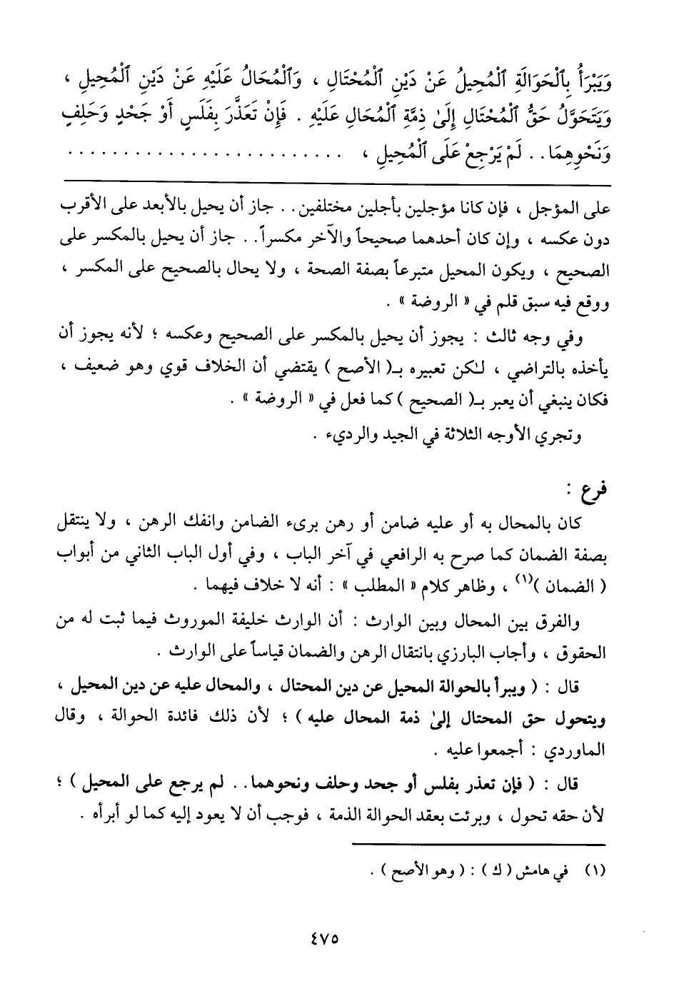 على المؤجل، فإن كانا مؤجلين بأجلين مختلفين .. جاز أن يحيل بالأبعد على الأقرب دون عكسه، وإن كان أحدهما صحيحًا والآخر مكسرًا .. جاز أن يحيل بالمكسر على الصحيح، ويكون المحيل متبرعًا بصفة الصحة، ولا يحال بالصحيح على المكسر، ووقع فيه سبق قلم في (الروضة).
