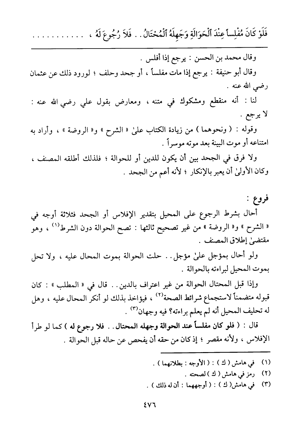 أحال بشرط الرجوع على المحيل بتقدير الإفلاس أو الجحد فثلاثة أوجه في (الشرح) و (الروضة) من غير تصحيح ثالثها: تصح الحوالة دون الشرط، وهو مقتضى إطلاق المصنف.