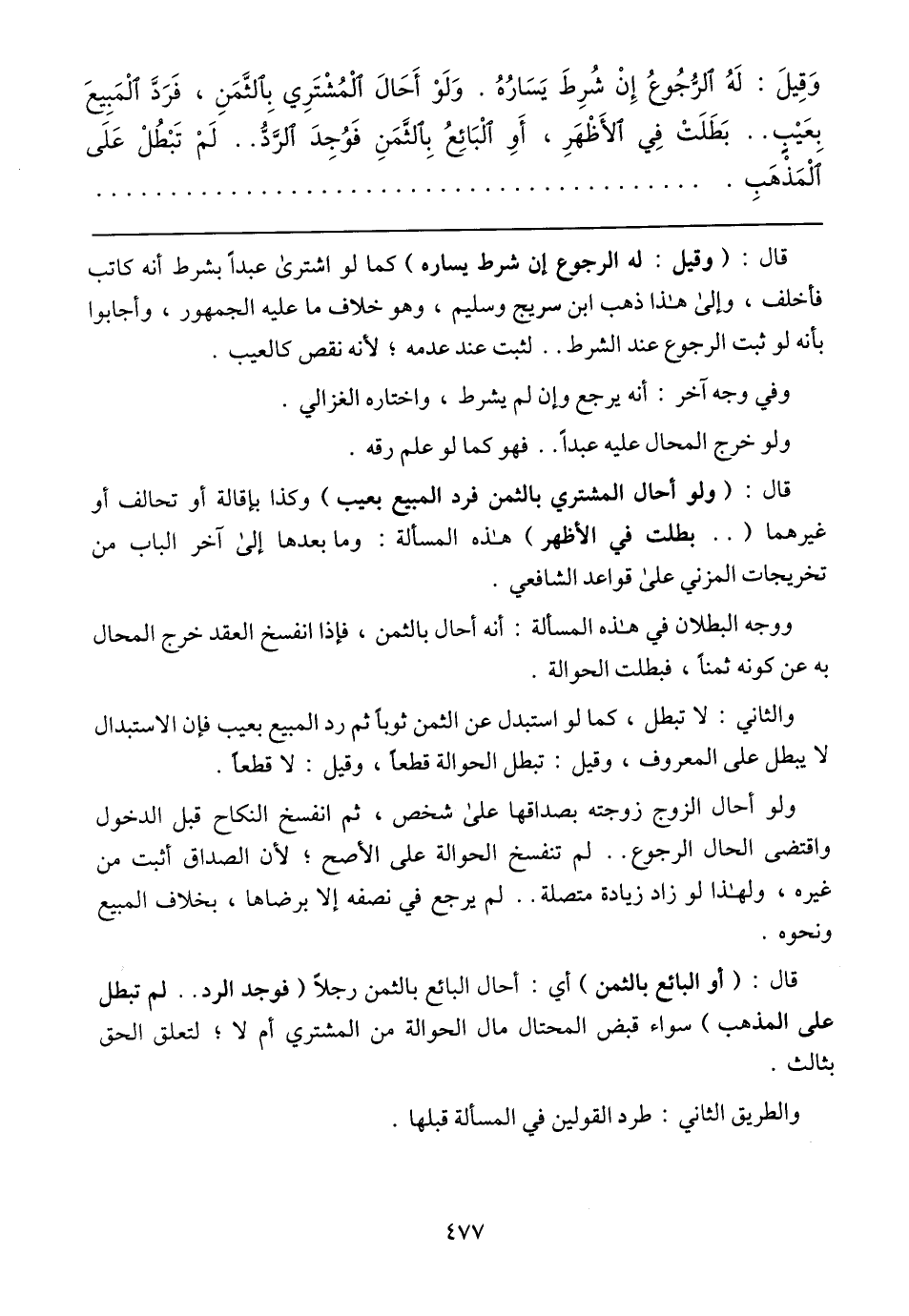 وَقِيلَ: لَهُ الرُّجُوعُ إِنْ شُرِطَ يَسَارُهُ. وَلَوْ أَحَالَ الْمُشْتَرِي بِالثَّمَنِ، فَرَدَّ الْمَبِيعَ بِعَيْبٍ .. بَطَلَتْ فِي الأَظْهَرِ، أَوِ الْبَائِعُ بِالثَّمَنِ فَوُجِدَ الرَّدُّ. لَمْ تَبْطُلْ عَلَى الْمَذْهَبِ
