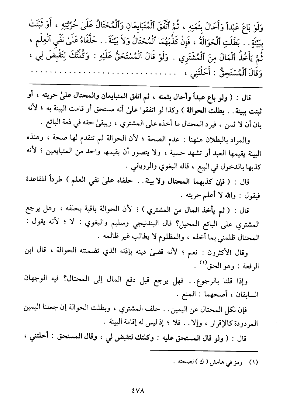 وَلَوْ بَاعَ عَبْدًا وَأَحَالَ بِثَمَنِهِ، ثُمَّ اتَّفَقَ الْمُتَبَايِعَانِ وَالْمُحْتَالُ عَلَى حُرِّيَّتِهِ، أَوْ ثَبَتَتْ بِبَيِّنَةٍ .. بَطَلَتِ الْحَوَالَةُ، فَإِنْ كَذَّبَهُمَا الْمُحْتَالُ وَلَا بَيِّنَةَ .. حَلَّفَاهُ عَلَى نَفْيِ الْعِلْمِ، ثُمَّ يَاخُذُ الْمَالَ مِنَ الْمُشْتَرِي. وَلَوْ قَالَ الْمُسْتَحَقُّ عَلَيْهِ: وَكَّلْتُكَ لِتَقْبِضَ لِي، وَقَالَ الْمُسْتَحِقُّ: أَحَلْتَنِي،