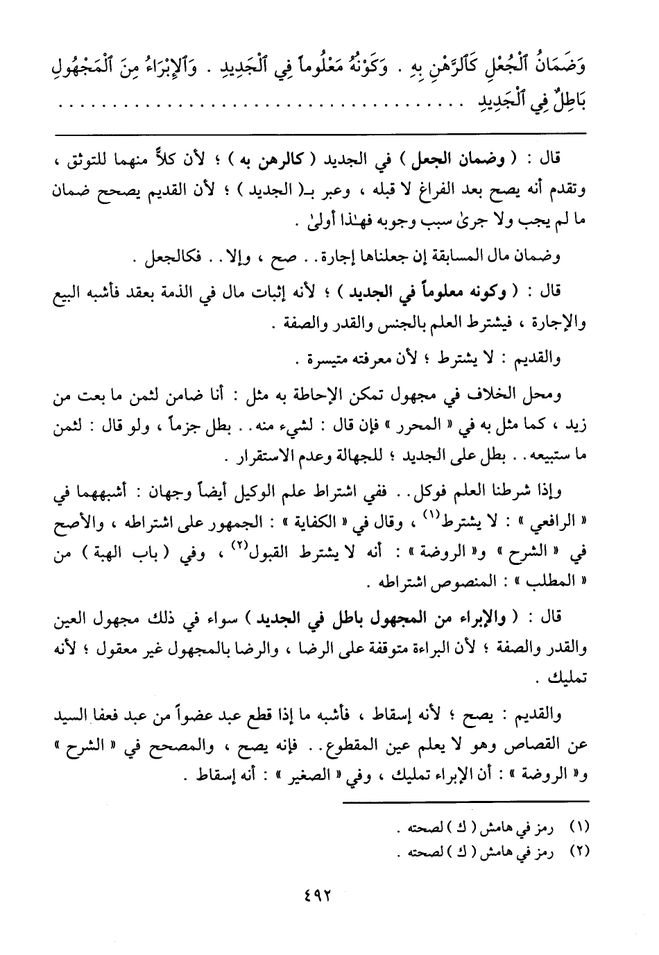 وَضَمَانُ الْجُعْلِ كَالرَّهْنِ بِهِ. وَكَوْنُهُ مَعْلُومًا فِي الْجَدِيدِ. وَالإِبْرَاءُ مِنَ الْمَجْهُولِ بَاطِلٌ فِي الْجَدِيدِ