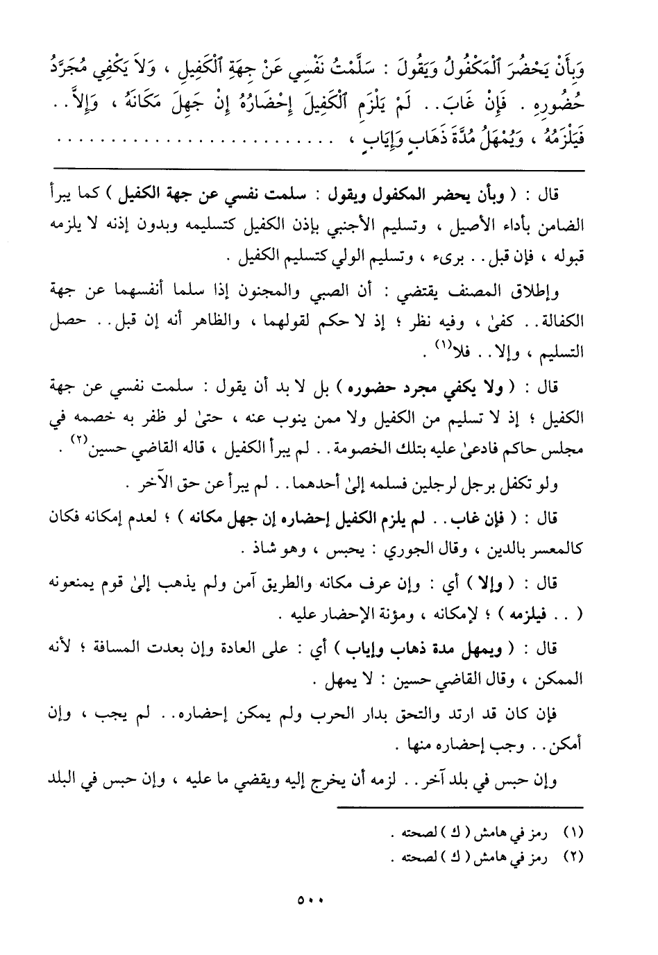 قال: (ولا يكفي مجرد حضوره) بل لابد أن يقول: سلمت نفسي عن جهة الكفيل؛ إذ لا تسليم من الكفيل ولا ممن ينوب عنه، حتى لو ظفر به خصمه في مجلس حاكم فادعى عليه بتلك الخصومة .. لم يبرأ الكفيل، قاله القاضي حسين.