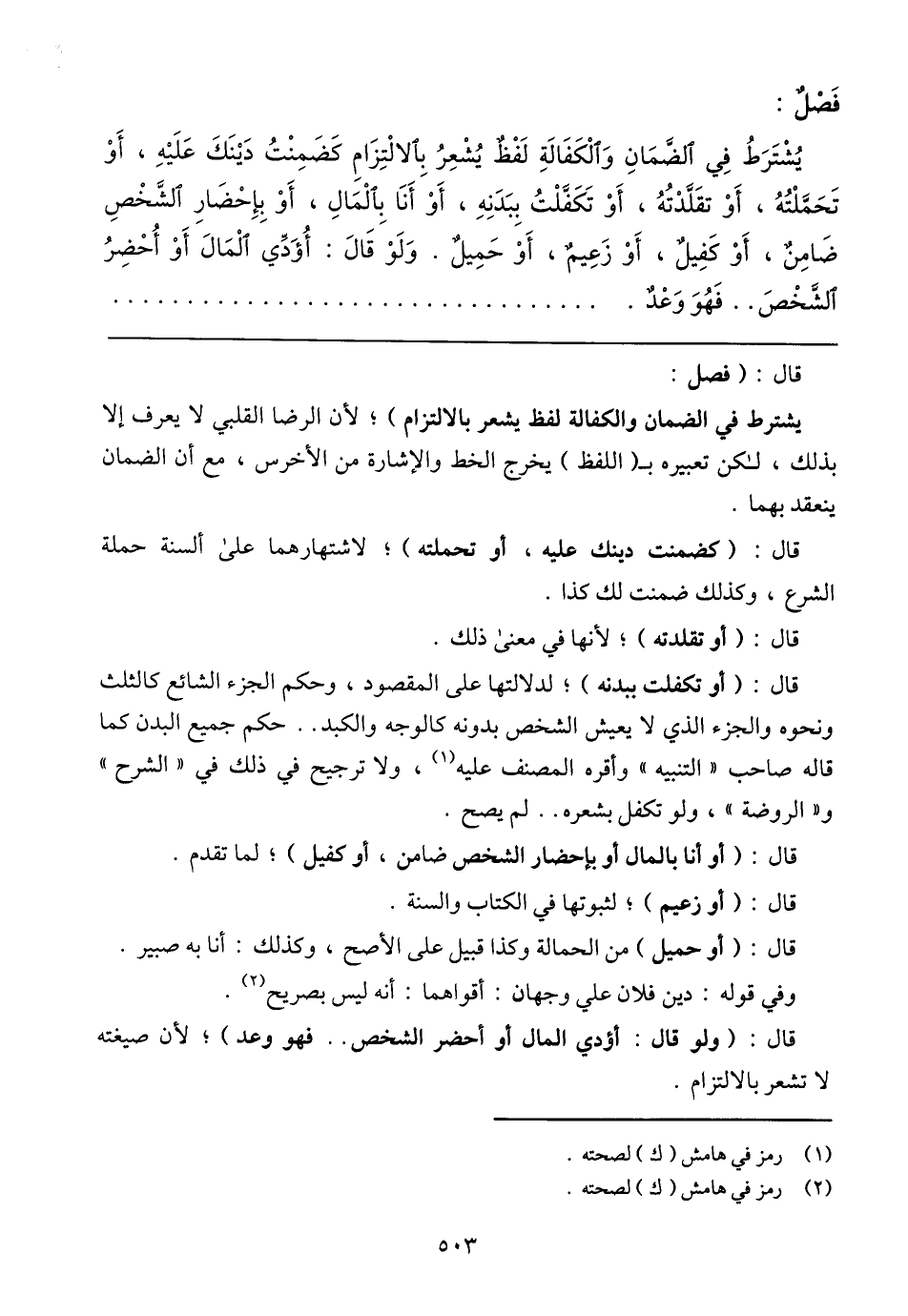 يُشْتَرَطُ فِي الضَّمَانِ والْكَفَالَةِ لَفْظٌ يُشْعِرُ بِالالْتِزَامِ كَضَمِنْتُ دَيْنَكَ عَلَيْهِ، أَوْ تَحَمَّلْتُهُ، أَوْ تقَلَّدْتُهُ، أَوْ تَكَفَّلْتُ بِبَدَنِهِ، أَوْ أَنَا بِالْمَالِ، أَوْ بِإِحْضَارِ الشَّخْصِ ضَامِنٌ، أَوْ كَفِيلٌ، أَوْ زَعِيمٌ، أَوْ حَمِيلٌ. وَلَوْ قَالَ: أُؤَدِّي الْمَالَ أَوْ أُحْضِرُ الشَّخْصَ .. فَهُوَ وَعْدٌ
