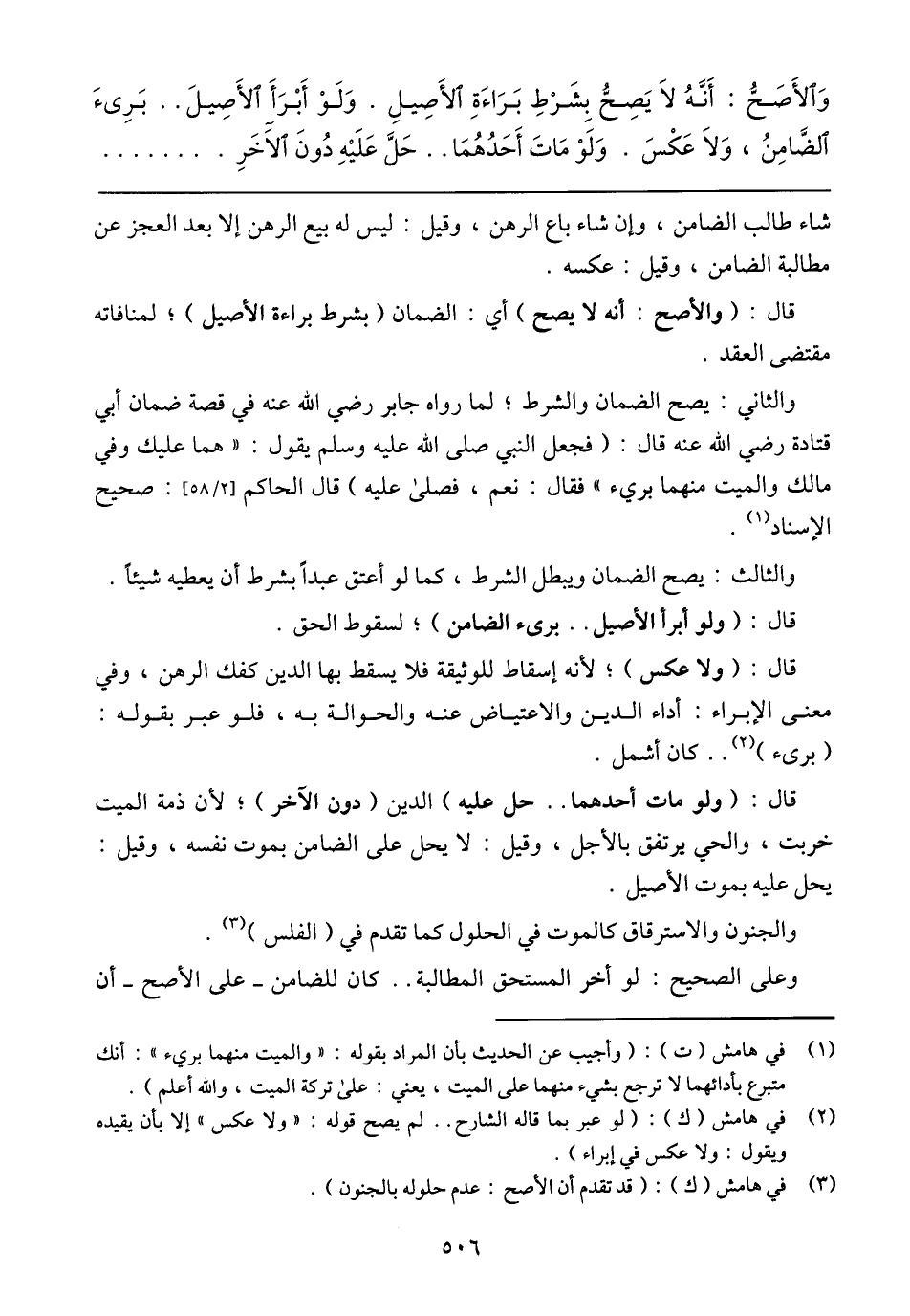 وَالأَصَحُّ: أَنَّهُ لَا يَصِحُّ بِشَرْطِ بَرَاءَةِ الأَصِيلِ. وَلَوْ أَبْرَأَ الأَصِيلَ .. بَرِئَ الضَّامِنُ، وَلَا عَكْسَ. وَلَوْ مَاتَ أَحَدُهُمَا .. حَلَّ عَلَيْهِ دُونَ الآَخَرِ