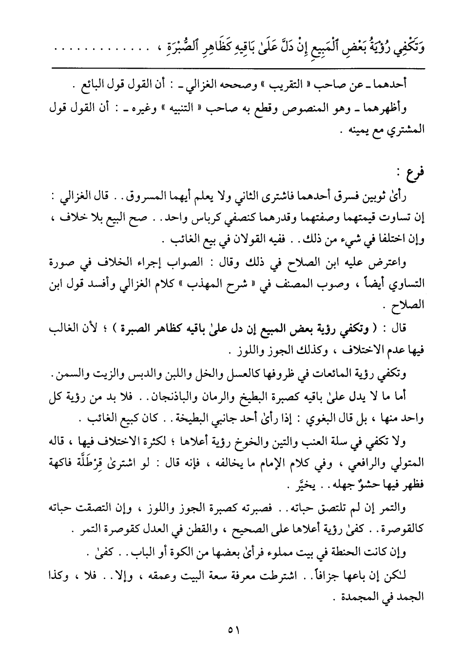 أما ما لا يدل على باقيه كصبرة البطيخ والرمان والباذنجان .. فلا بد من رؤية كل واحد منها، بل قال البغوي: إذا رأى أحد جانبي البطيخة .. كان كبيع الغائب.