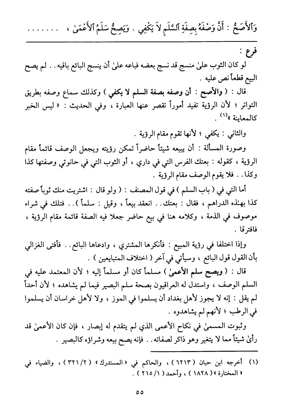 قال: (ويصح سلم الأعمى) مسلمًا كان أو مسلمًا إليه؛ لأن المعتمد عليه في السلم الوصف، واستدل له العراقيون بصحة سلم البصير فيما لم يشاهده؛ لأن أحدًا لم يقل: أنه لا يجوز لأهل بغداد أن يسلموا في الموز، ولا لأهل خراسان أن يسلموا في الرطب؛ لأنهم لم يشاهدوه.