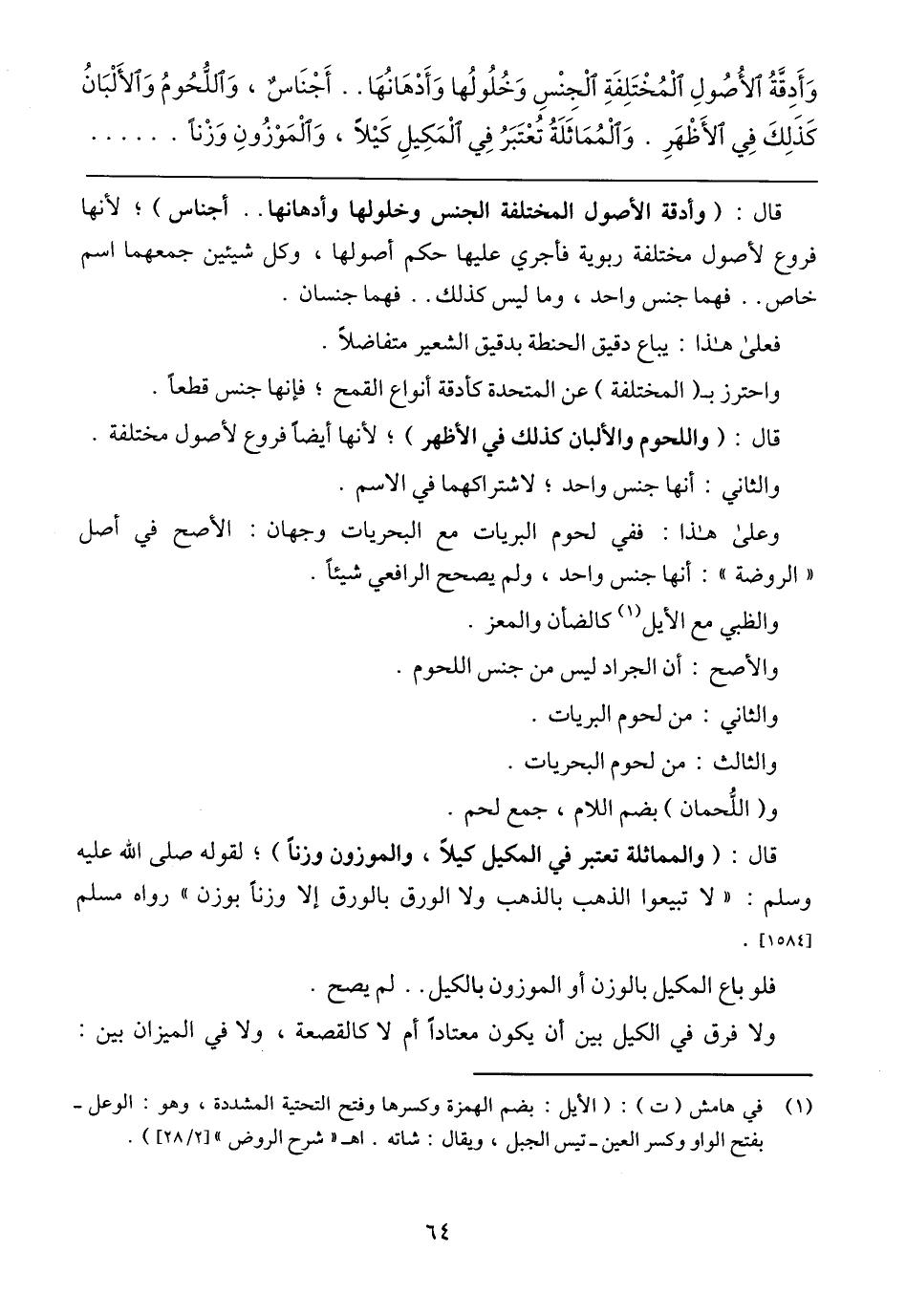 وَأَدِقَّةُ الأُصُولِ الْمُخْتَلِفَةِ الْجِنْسِ وَخُلُولُها وَأَدْهَانُهَا .. أَجْنَاسٌ، وَاللُّحُومُ وَالأَلْبَانُ كَذَلِكَ فِي الأَظْهَرِ. وَالْمُمَاثَلَةُ تُعْتَبَرُ فِي الْمَكِيلِ كَيْلًا، والْمَوْزُونِ وَزْنًا