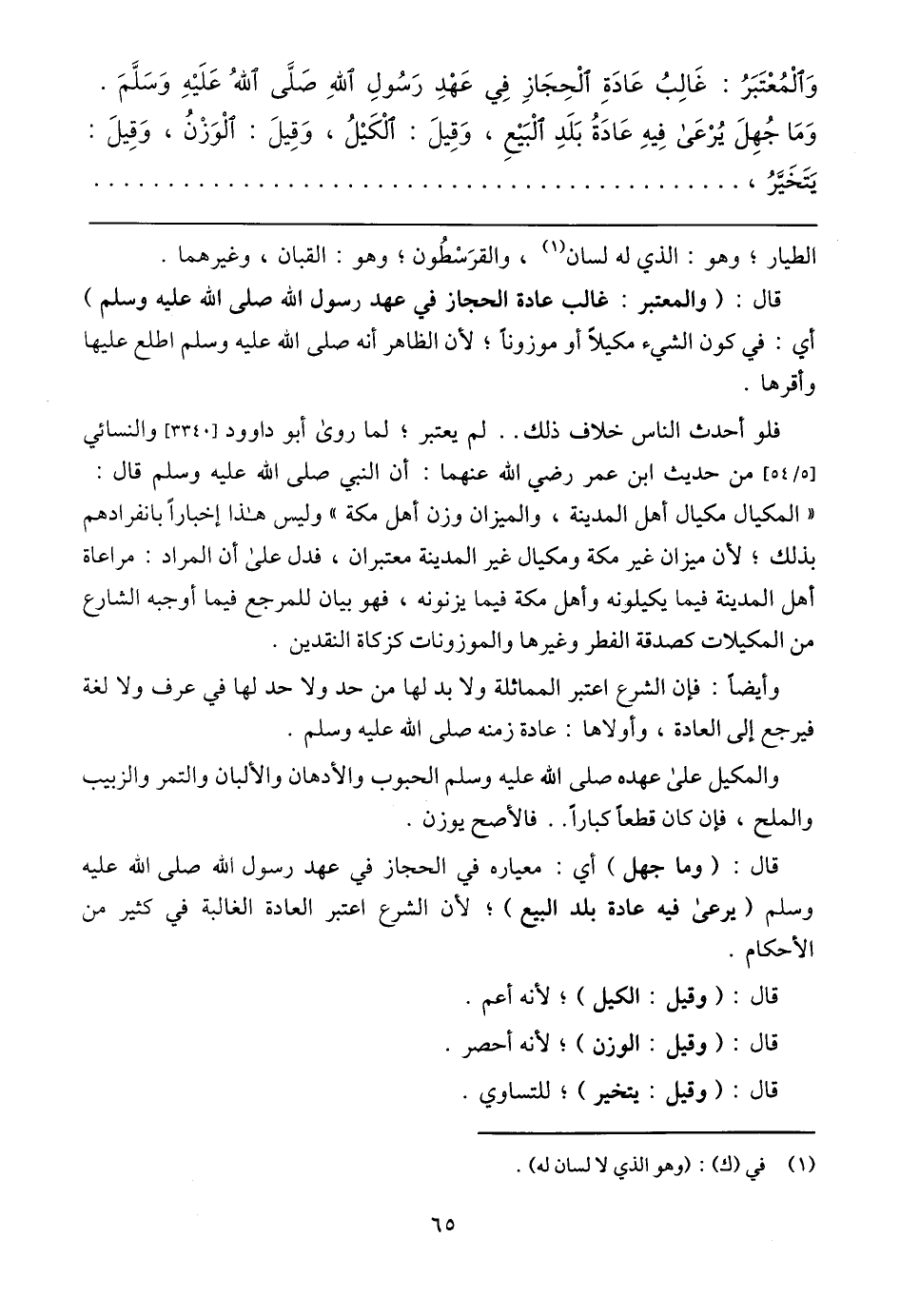 وَالْمُعْتَبَرُ: غَالِبُ عَادَةِ الْحِجَازِ فِي عَهْدِ رَسُولِ اللهِ صَلَّى اللهُ عَلَيْهِ وَسَلَّمَ. وَمَا جُهِلَ يُرْعَى فِيهِ عَادَةُ بَلَدِ الْبَيْعِ، وَقِيلَ: الْكَيْلُ، وَقِيلَ: الْوَزْنُ، وَقِيلَ: يَتَخَيَّرُ،
