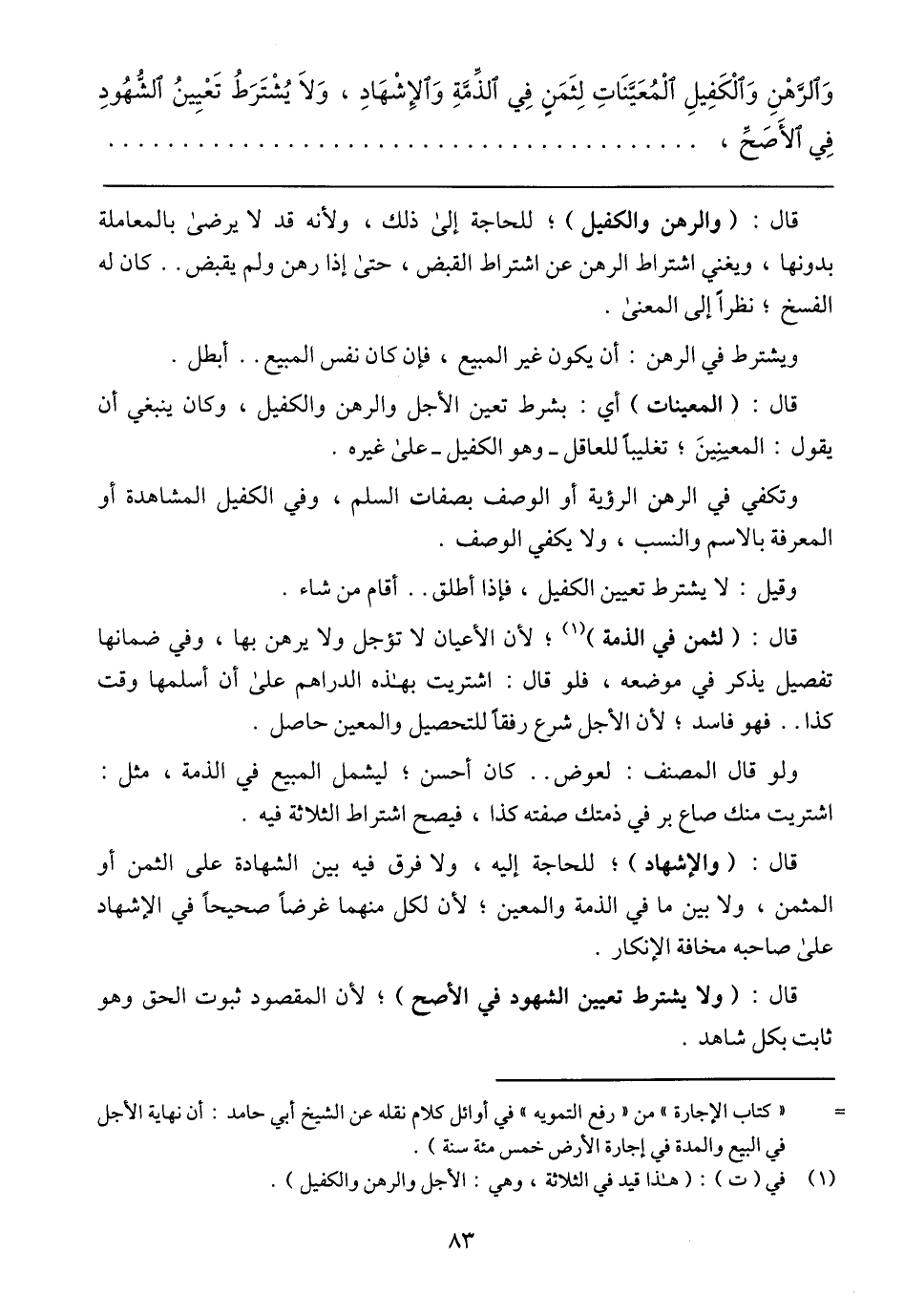 وَالرَّهْنِ وَالْكَفِيلِ الْمُعَيَّنَاتِ لِثَمَنٍ فِي الذِّمَّةِ وَالإِشْهَادِ، وَلَا يُشْتَرَطُ تَعْيِينُ الشُّهُودِ فِي الأَصَحِّ،