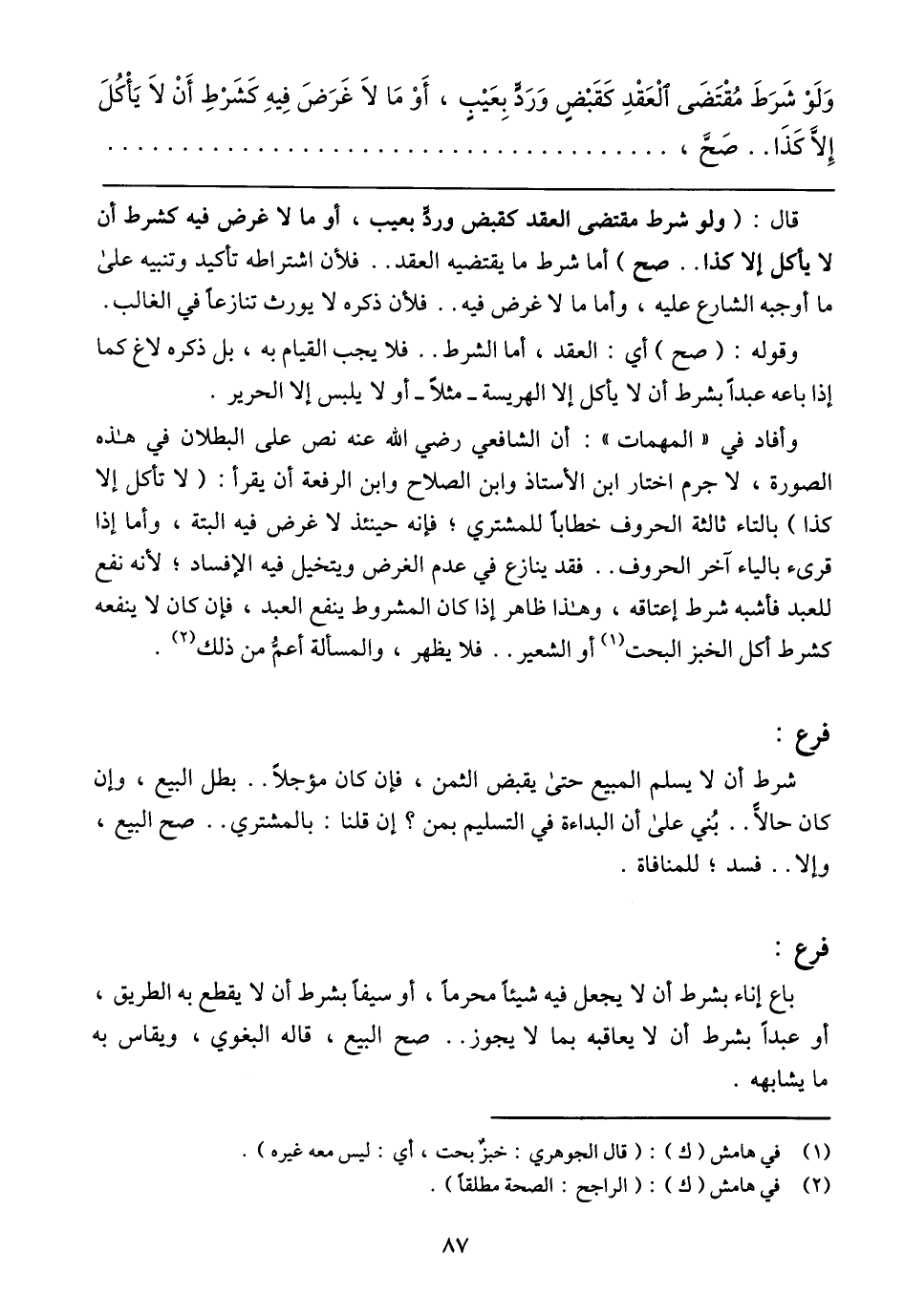 قال: (ولو شرط مقتضى العقد كقبض وردٍّ بعيب، أو ما لا غرض فيه كشرط أن لا يأكل إلا كذا .. صح) أما شرط ما يقتضيه العقد .. فلأن اشتراطه تأكيد وتنبيه على ما أوجبه الشارع عليه، وأما ما لا غرض فيه .. فلأن ذكره لا يورث تنازعًا في الغالب.