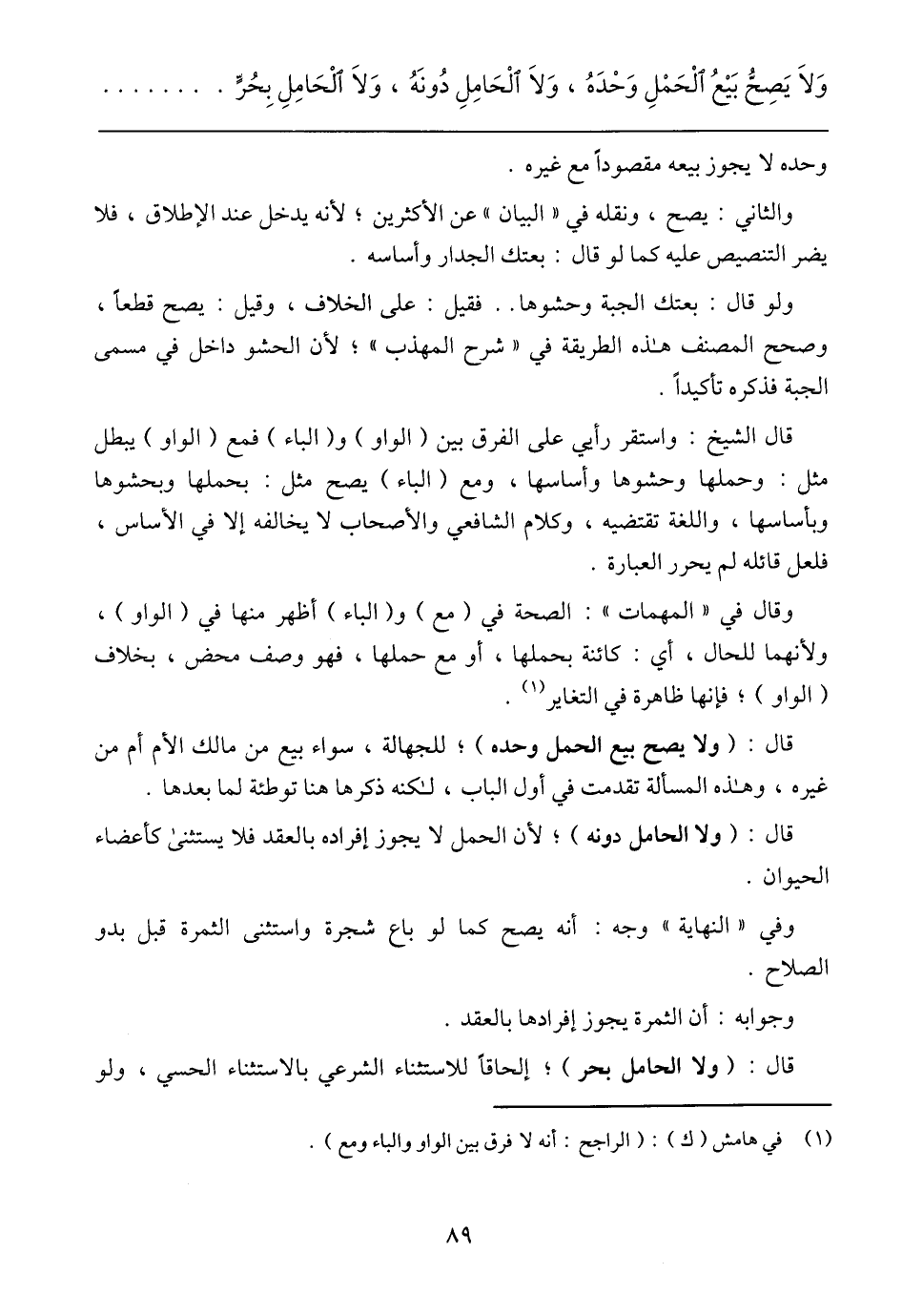 قال الشيخ: واستقر رأيي على الفرق بين (الواو) و (الباء) فمع (الواو) يبطل مثل: وحملها وحشوها وأساسها، ومع (الباء) يصح مثل: بحملها وبحشوها وبأساسها، واللغة تقتضيه، وكلام الشافعي والأصحاب لا يخالفه إلا في الأساس، فلعل قائله لم يحرر العبارة.