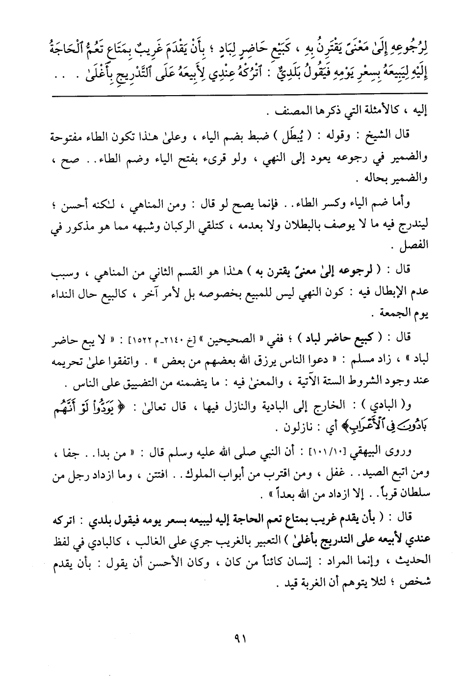 قال: (بأن يقدم غريب بمتاع تعم الحاجة إليه ليبيعه بسعر يومه فيقول بلدي: اتركه عندي لأبيعه على التدريج بأغلى) التعبير بالغريب جرى على الغالب، كالبادي في لفظ الحديث، وإنما المراد: إنسان كائنًا من كان، وكان الأحسن أن يقول: بأن يقدم شخص؛ لئلا يتوهم أن الغربة قيد.