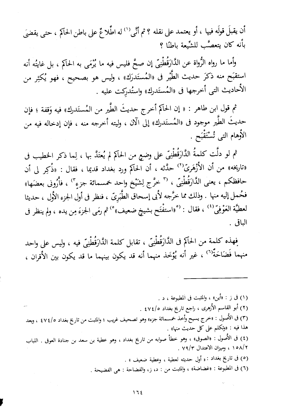ثمَّ لَو دلّت كلمة الدَّارَقُطْنِيّ على وضع من الْحَاكِم لم يعْتد بهَا لما ذكر الْخَطِيب فِي تَارِيخه من أَن الْأَزْهَرِي حَدثهُ أَن الْحَاكِم ورد بَغْدَاد قَدِيما فَقَالَ ذكر لي أَن حافظكم يَعْنِي الدَّارَقُطْنِيّ خرج لشيخ وَاحِد خَمْسمِائَة جُزْء فأروني بَعْضهَا فَحمل إِلَيْهِ مِنْهَا