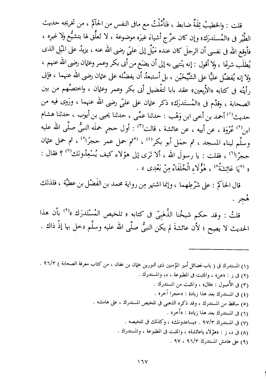 قلت والخطيب ثِقَة ضَابِط فتأملت مَعَ مَا فِي النَّفس من الْحَاكِم من تَخْرِيجه حَدِيث الطير فِي الْمُسْتَدْرك وَإِن كَانَ خرج أَشْيَاء غير مَوْضُوعَة لَا تعلق لَهَا بتشيع وَلَا غَيره فأوقع الله فِي نَفسِي أَن الرجل كَانَ عِنْده ميل إِلَى عَليّ رَضِي الله عَنهُ يزِيد على الْميل الَّذِي يطْلب شرعا وَلَا أَقُول إِنَّه يَنْتَهِي بِهِ إِلَى أَن يضع من أبي بكر وَعمر وَعُثْمَان رَضِي الله عَنْهُم وَلَا إِنَّه يفضل عليا على الشَّيْخَيْنِ بل أستبعد أَن يفضله على عُثْمَان رَضِي الله عَنْهُمَا فَإِنِّي رَأَيْته فِي كِتَابه الْأَرْبَعين عقد بَابا لتفضيل أبي بكر وَعمر وَعُثْمَان واختصهم من بَين الصَّحَابَة وَقدم فِي الْمُسْتَدْرك ذكر عُثْمَان على عَليّ رَضِي الله عَنْهُمَا وروى فِيهِ من حَدِيث أَحْمد بن أخي ابْن وهب حَدثنَا عمي حَدثنَا يحيى بن أَيُّوب حَدثنَا هِشَام ابْن عُرْوَة عَن أَبِيه عَن عَائِشَة قَالَت أول حجر حمله النَّبِي صلى الله عَلَيْهِ وَسلم لبِنَاء الْمَسْجِد ثمَّ حمل أَبُو بكر ثمَّ حمل عمر حجرا ثمَّ حمل عُثْمَان حجرا فَقلت يَا رَسُول الله أَلا ترى إِلَى هَؤُلَاءِ كَيفَ يسعدونك فَقَالَ (يَا عَائِشَة هَؤُلَاءِ الْخُلَفَاء من بعدِي)