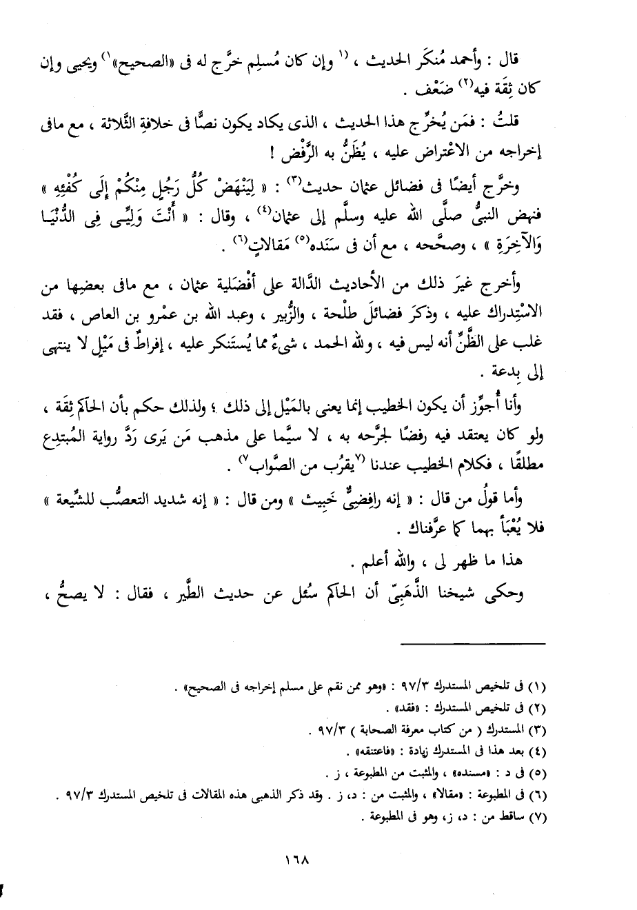 وَأخرج غير ذَلِك من الْأَحَادِيث الدَّالَّة على أَفضَلِيَّة عُثْمَان مَعَ مَا فِي بَعْضهَا من الِاسْتِدْرَاك عَلَيْهِ وَذكر فَضَائِل طَلْحَة وَالزُّبَيْر وَعبد الله بن عَمْرو بن الْعَاصِ فقد غلب على الظَّن أَنه لَيْسَ فِيهِ وَللَّه الْحَمد شَيْء مِمَّا يستنكر عَلَيْهِ إفراط فِي ميل لَا يَنْتَهِي إِلَى بِدعَة