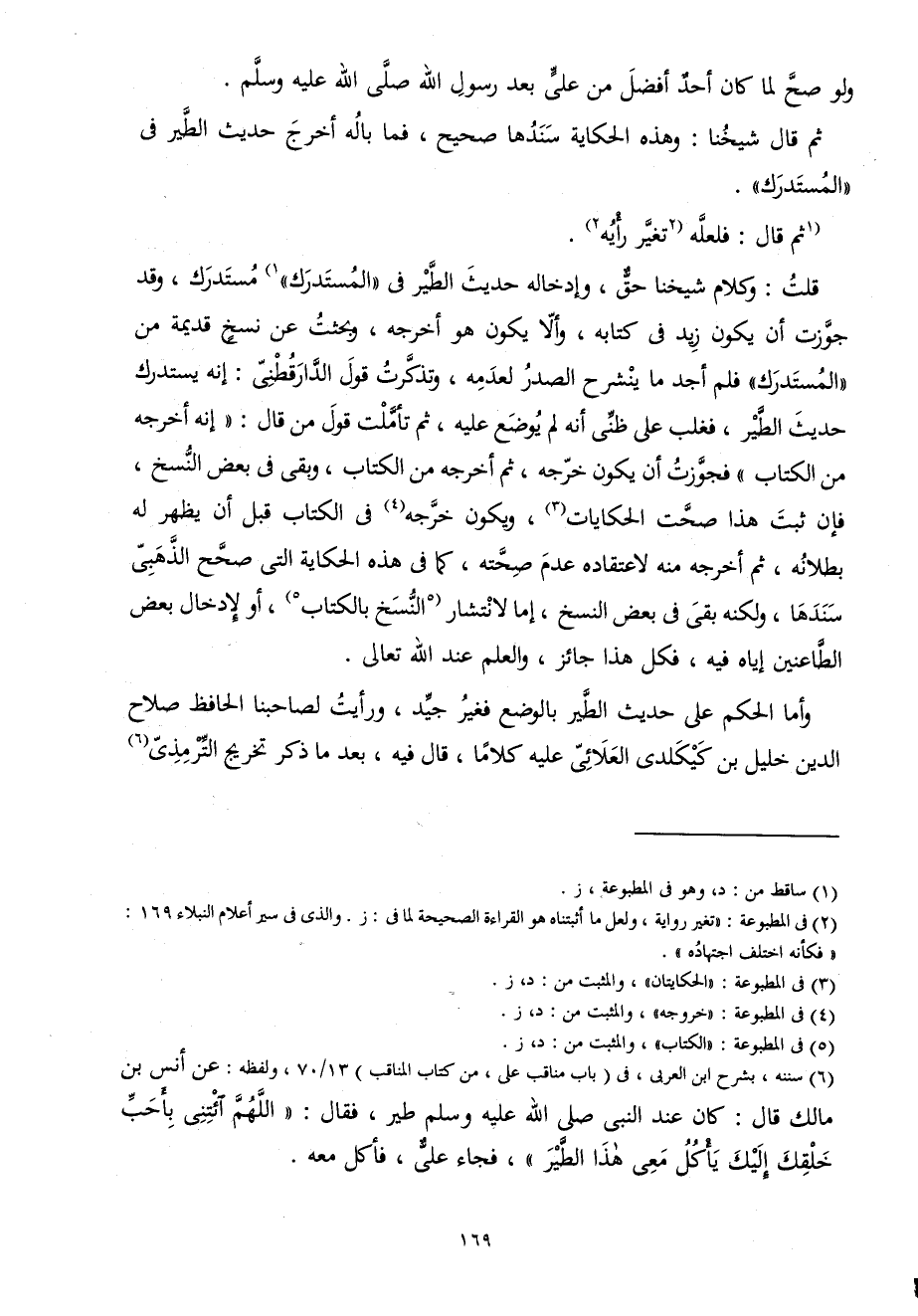 قلت وَكَلَام شَيخنَا حق وإدخاله حَدِيث الطير فِي الْمُسْتَدْرك مُسْتَدْرك وَقد جوزت أَن يكون زيد فِي كِتَابه وَألا يكون هُوَ أخرجه وبحثت عَن نسخ قديمَة من الْمُسْتَدْرك فَلم أجد مَا ينشرح الصَّدْر لعدمه وتذكرت قَول الدَّارَقُطْنِيّ إِنَّه يسْتَدرك حَدِيث الطير فغلب على ظَنِّي أَنه لم يوضع عَلَيْهِ ثمَّ تَأَمَّلت قَول من قَالَ إِنَّه أخرجه من الْكتاب فجوزت أَن يكون خرجه ثمَّ أخرجه من الْكتاب وَبَقِي فِي بعض النّسخ فَإِن ثَبت هَذَا صحت الحكايات وَيكون خرجه فِي الْكتاب قبل أَن يظْهر لَهُ بُطْلَانه ثمَّ أخرجه مِنْهُ لاعْتِقَاده عدم صِحَّته كَمَا فِي هَذِه الْحِكَايَة الَّتِي صحّح الذَّهَبِيّ سندها وَلكنه بَقِي فِي بعض النّسخ إِمَّا لانتشار النّسخ بِالْكتاب أَو لإدخال بعض الطاعنين إِيَّاه فِيهِ فَكل هَذَا جَائِز وَالْعلم عِنْد الله تَعَالَى