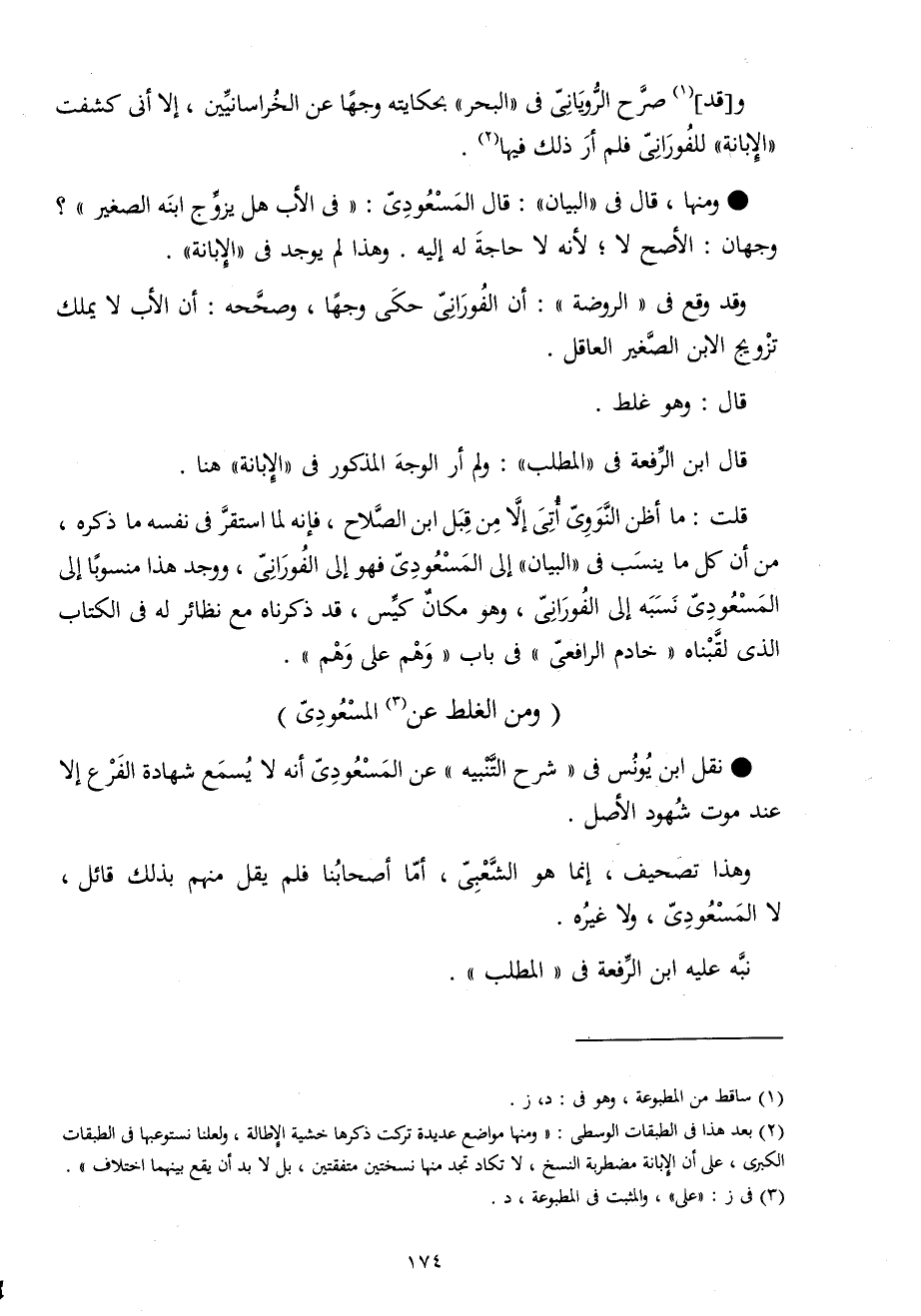 قلت مَا أَظن النَّوَوِيّ أُتِي إِلَّا من قبل ابْن الصّلاح فَإِنَّهُ لما اسْتَقر فِي نَفسه مَا ذكره من أَن كل مَا ينْسب فِي الْبَيَان إِلَى المَسْعُودِيّ فَهُوَ إِلَى الفوراني وَوجد هَذَا مَنْسُوبا إِلَى المَسْعُودِيّ نسبه إِلَى الفوراني وَهُوَ مَكَان كيس قد ذَكرْنَاهُ مَعَ نَظَائِر لَهُ فِي الْكتاب الَّذِي لقبناه خَادِم الرَّافِعِيّ فِي بَاب وهم على وهم