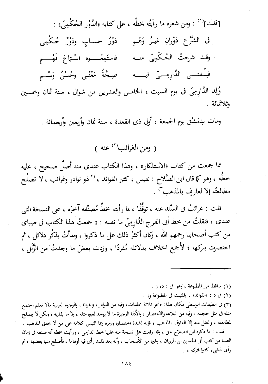 قلت غرائب فِي السَّنَد عَنهُ توقفا لما رَأَيْته بِخَط مُصَنفه آخِره على النُّسْخَة الَّتِي عِنْدِي فنقلت من خطّ أبي الْفرج الدَّارمِيّ مَا نَصه جمعت هَذَا الْكتاب فِي صباي من كتب أَصْحَابنَا رَحِمهم الله وَكَانَ أَكثر ذَلِك على مَا ذكرُوا وبدأت بِذكر دَلَائِل ثمَّ اختصرت بِتَرْكِهَا لأجمع الْخلاف بدلائله مُفردا وزدت بعض مَا وجدت من الزلل