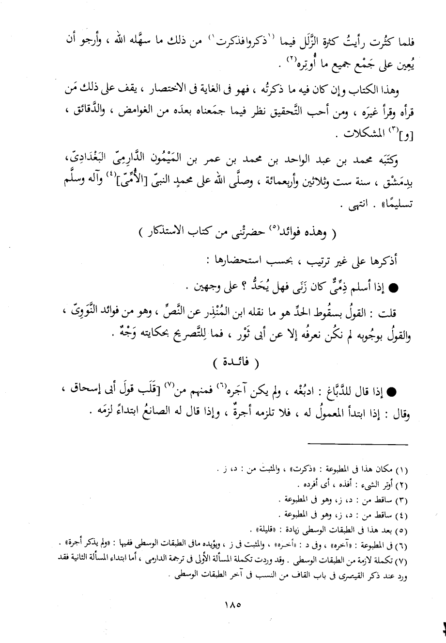 وَهَذِه فَوَائِد حضرتني من كتاب الاستذكار