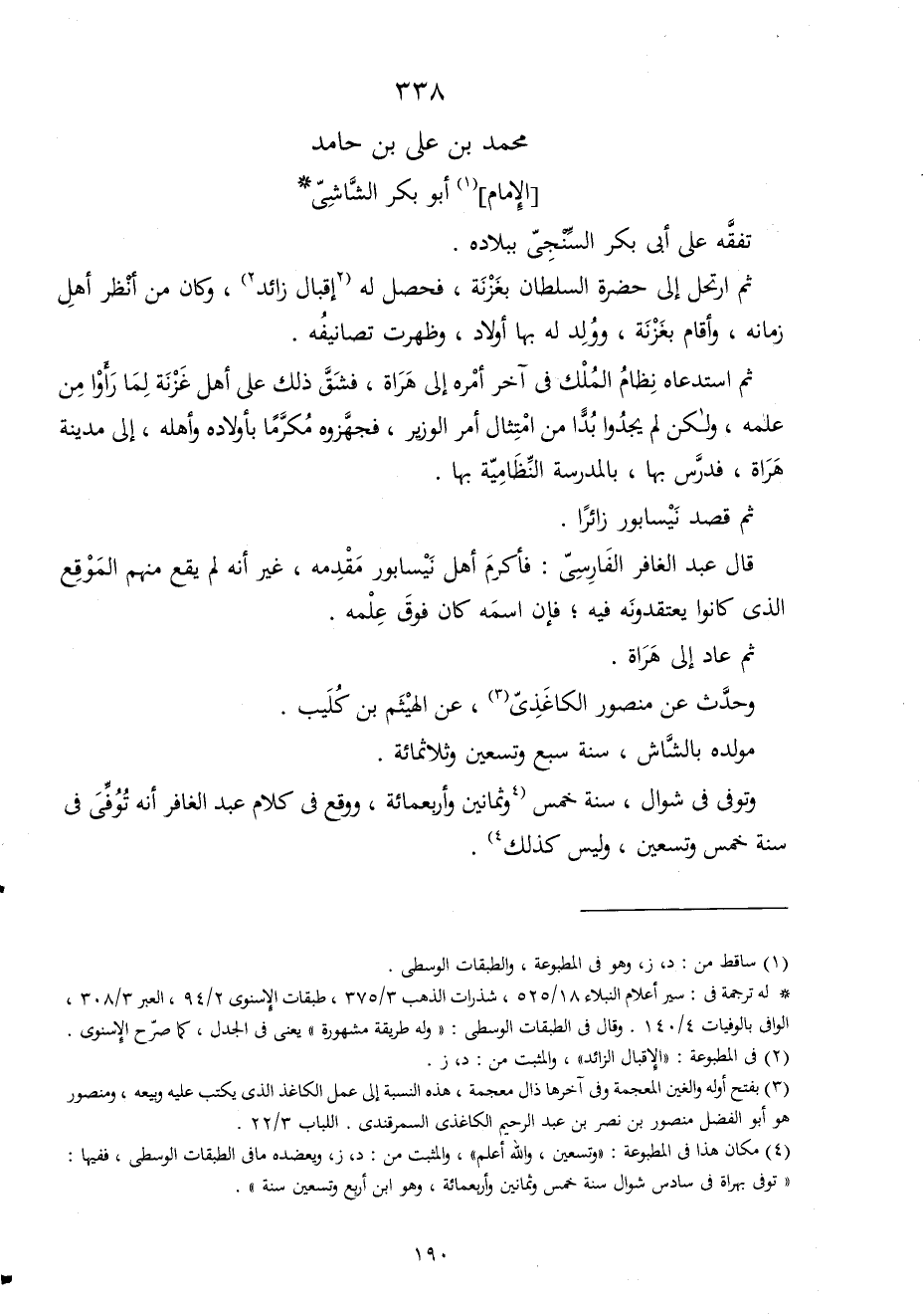 338 - مُحَمَّد بن عَليّ بن حَامِد الإِمَام أَبُو بكر الشَّاشِي