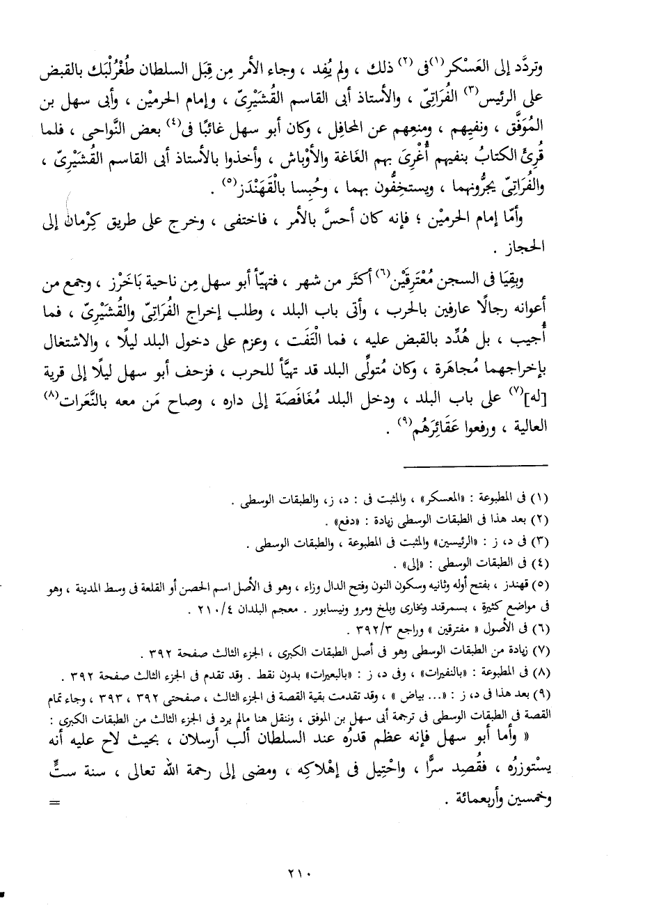 وَتردد إِلَى الْعَسْكَر فِي ذَلِك وَلم يفد وَجَاء الْأَمر من قبل السُّلْطَان طغرلبك بِالْقَبْضِ على الرئيس الفراتي والأستاذ أبي الْقَاسِم الْقشيرِي وَإِمَام الْحَرَمَيْنِ وَأبي سهل بن الْمُوفق ونفيهم ومنعهم عَن المحافل وَكَانَ أَبُو سهل غَائِبا فِي بعض النواحي فَلَمَّا قرىء الْكتاب بنفيهم أغري بهم الغاغة والأوباش وَأخذُوا بالأستاذ أبي الْقَاسِم الْقشيرِي والفراتي يجرونهما ويستخفون بهما وحبسا بالقهندز