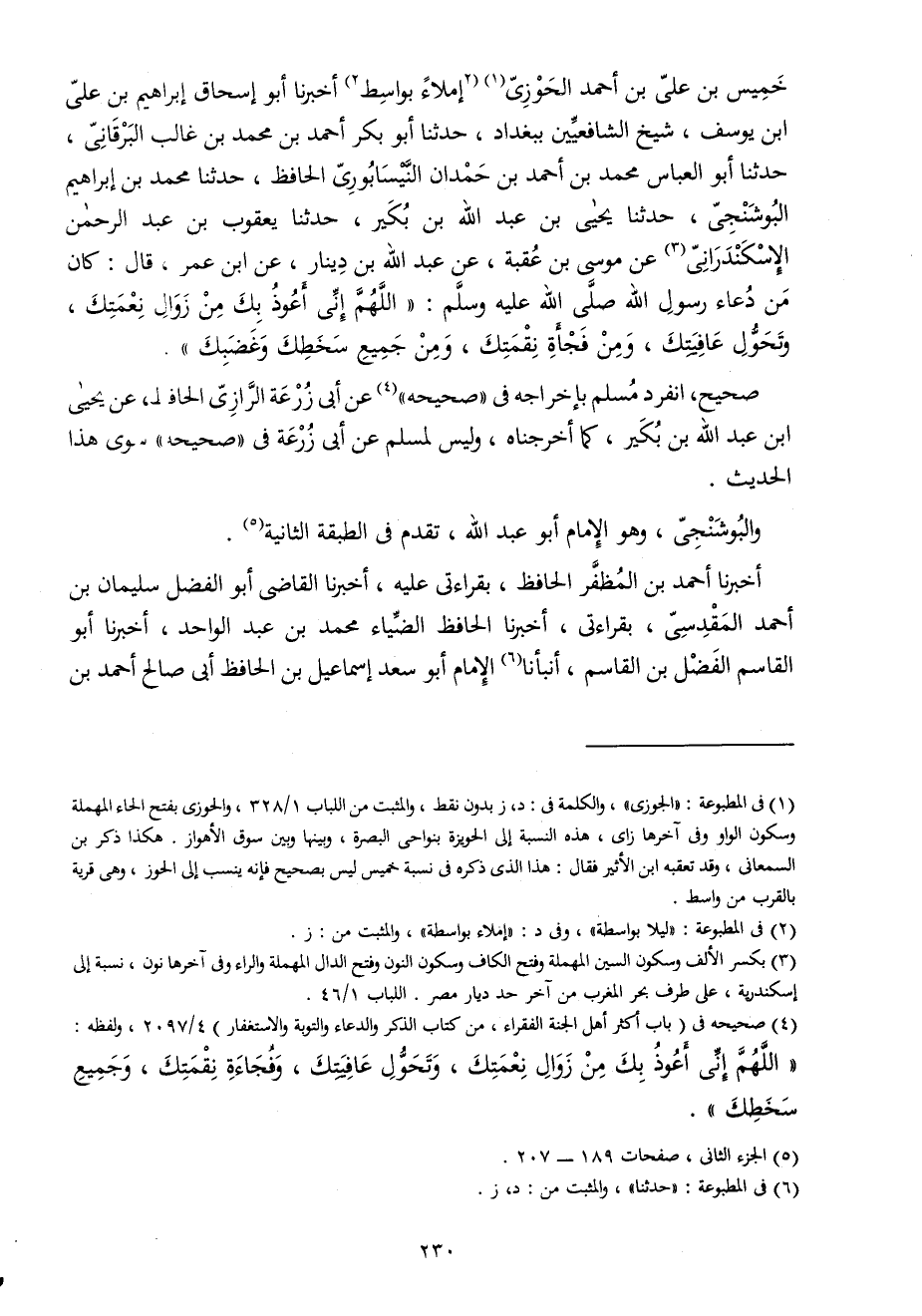 خَمِيس بن عَليّ بن أَحْمد الْحَوْزِيِّ إملاء بواسط أخبرنَا أَبُو إِسْحَاق إِبْرَاهِيم بن عَليّ ابْن يُوسُف شيخ الشافعيين بِبَغْدَاد حَدثنَا أَبُو بكر أَحْمد بن مُحَمَّد بن غَالب البرقاني حَدثنَا أَبُو الْعَبَّاس مُحَمَّد بن أَحْمد بن حمدَان النَّيْسَابُورِي الْحَافِظ حَدثنَا مُحَمَّد بن إِبْرَاهِيم البوشنجي حَدثنَا يحيى بن عبد الله بن بكير حَدثنَا يَعْقُوب بن عبد الرَّحْمَن الإسْكَنْدراني عَن مُوسَى بن عقبَة عَن عبد الله بن دِينَار عَن ابْن عمر قَالَ كَانَ من دُعَاء رَسُول الله صلى الله عَلَيْهِ وَسلم (اللَّهُمَّ إِنِّي أعوذ بك من زَوَال نِعْمَتك وتحول عافيتك وَمن فَجْأَة نقمتك وَمن جَمِيع سخطك وغضبك)