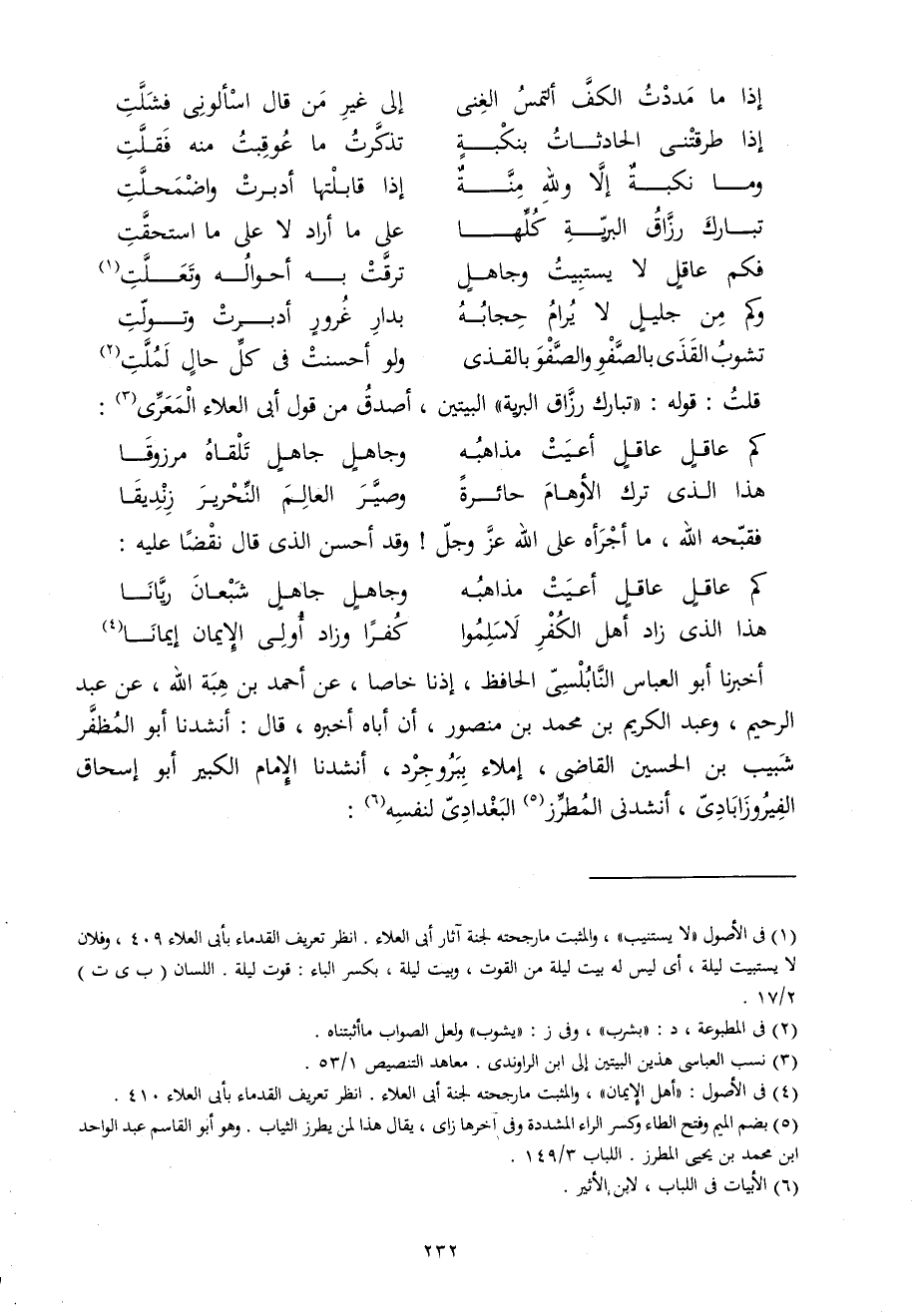 قلت قَوْله تبَارك رزاق الْبَريَّة الْبَيْتَيْنِ أصدق من قَول أبي الْعَلَاء المعري
