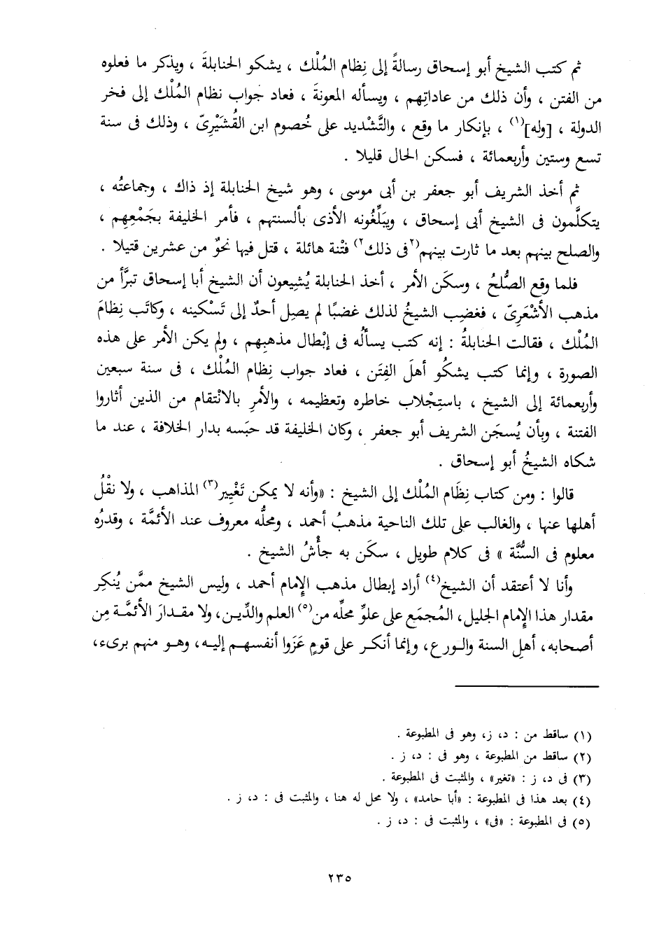 فَلَمَّا وَقع الصُّلْح وَسكن الْأَمر أَخذ الْحَنَابِلَة يشيعون أَن الشَّيْخ أَبَا إِسْحَاق تَبرأ من مَذْهَب الْأَشْعَرِيّ فَغَضب الشَّيْخ لذَلِك غَضبا لم يصل أحد إِلَى تسكينه وَكَاتب نظام الْملك فَقَالَت الْحَنَابِلَة إِنَّه كتب يسْأَله فِي إبِْطَال مَذْهَبهم وَلم يكن الْأَمر على هَذِه الصُّورَة وَإِنَّمَا كتب يشكو أهل الْفِتَن فَعَاد جَوَاب نظام الْملك فِي سنة سبعين وَأَرْبَعمِائَة إِلَى الشَّيْخ باستجلاب خاطره وتعظيمه وَالْأَمر بالانتقام من الَّذين أثاروا الْفِتْنَة وَبِأَن يسجن الشريف أَبُو جَعْفَر وَكَانَ الْخَلِيفَة قد حَبسه بدار الْخلَافَة عِنْد مَا شكاه الشَّيْخ أَبُو إِسْحَاق